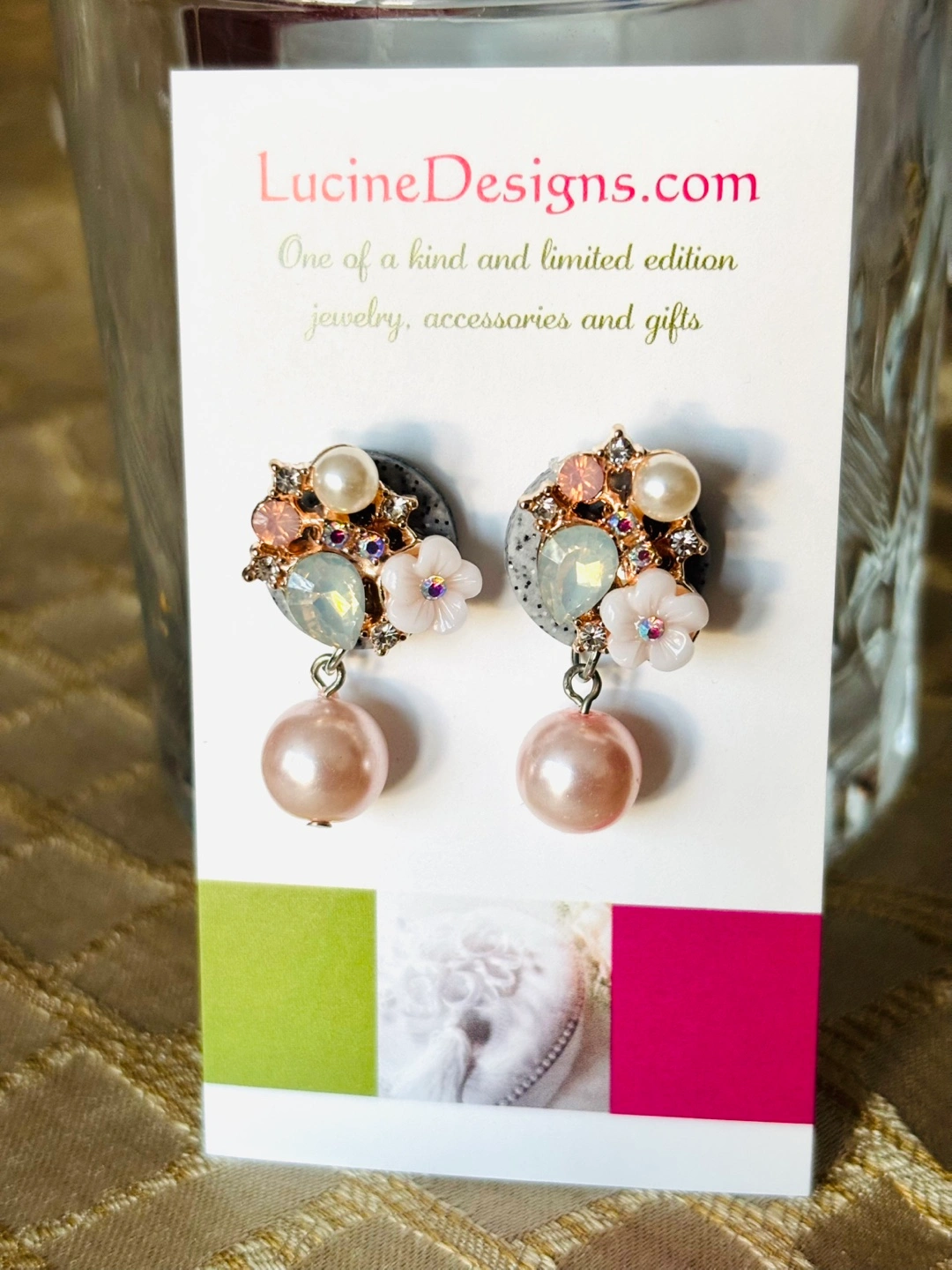 These are a beautiful pair of earrings from Lucine Designs! They feature a pearl drop design with floral and gemstone accents. Perfect for adding a touch of elegance to any outfit