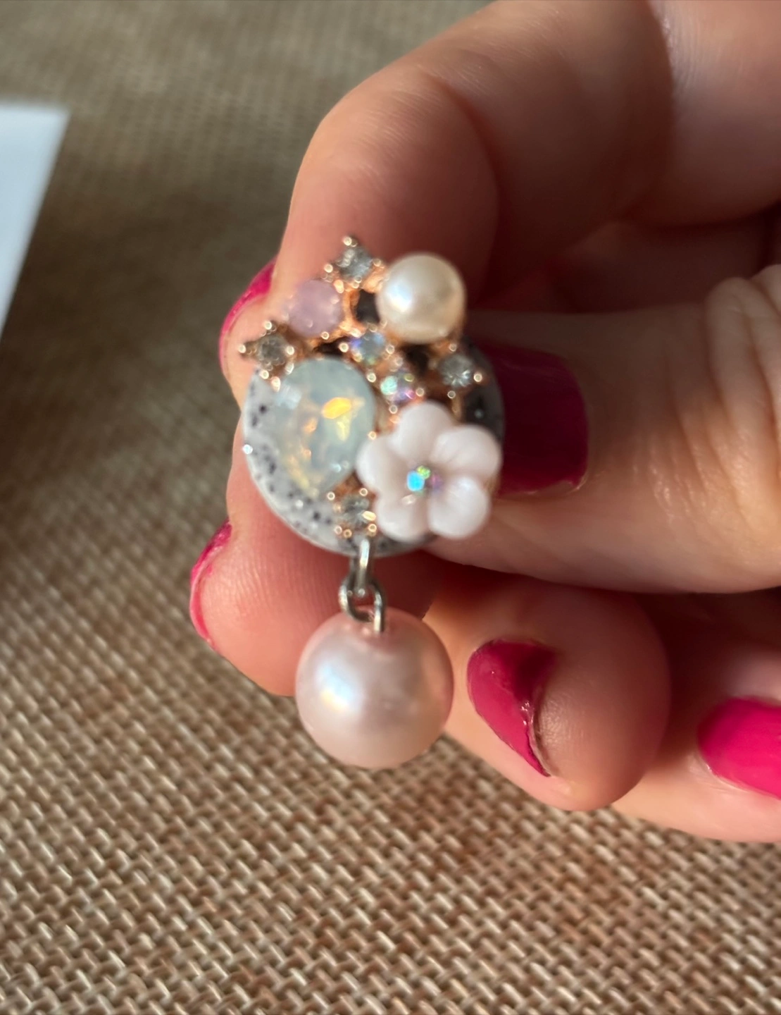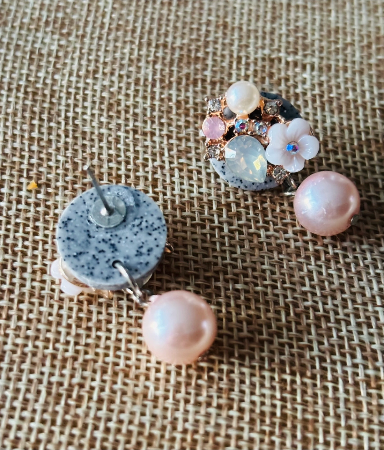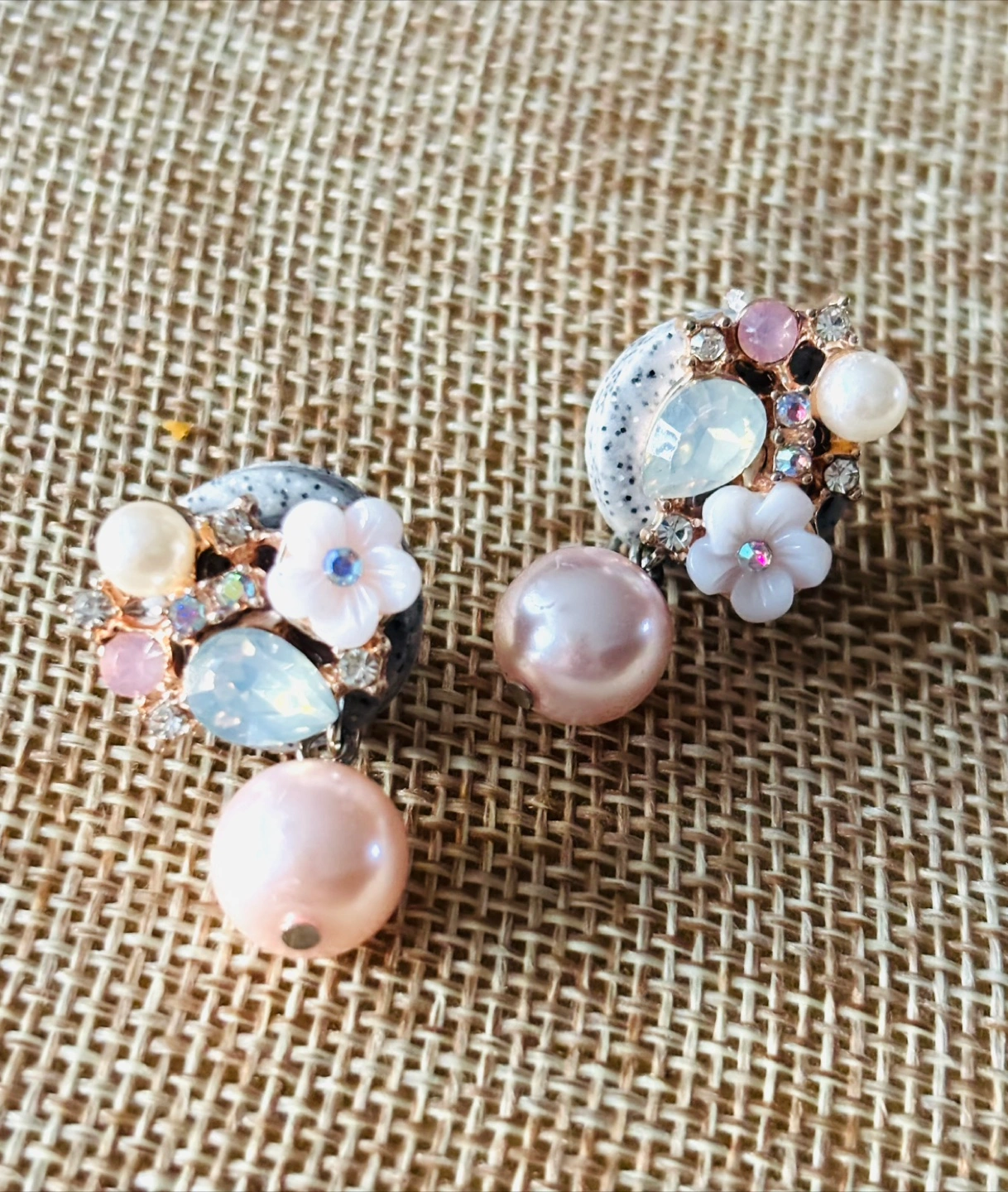 Floral pastels earring with pink pearl drop.