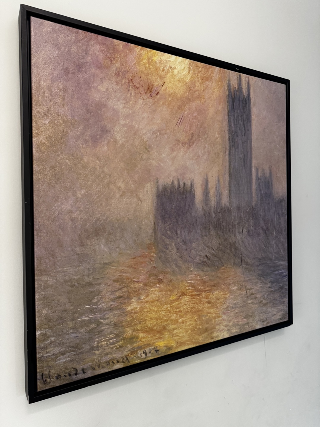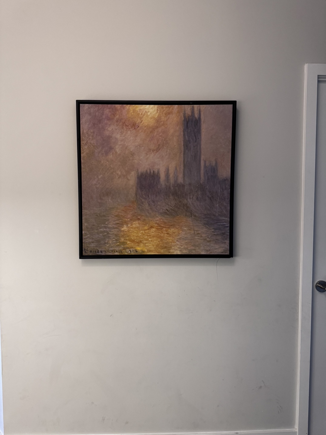 Selling a framed print of Claude Monet's "Houses of Parliament". Some damage on frame. The frame is black and complements the colours in the print nicely. It's a beautiful piece of art that would add a touch of elegance to any room. 31.5 inches x 31.5 inches