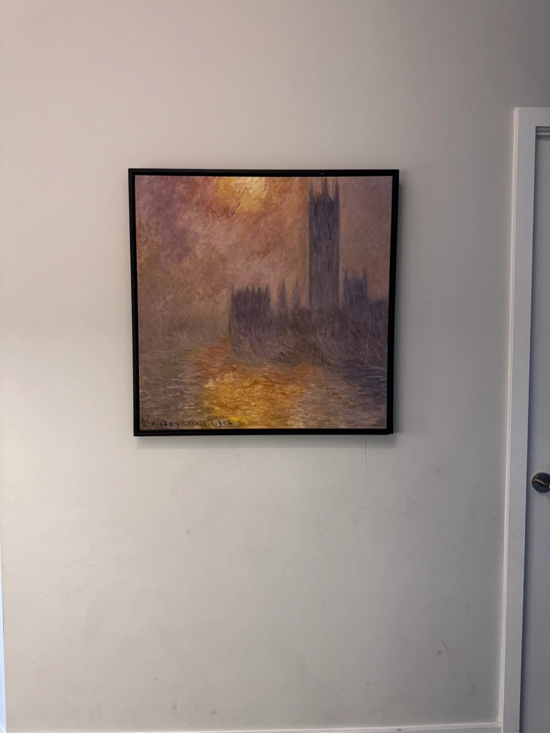Selling a framed print of Claude Monet's "Houses of Parliament". Some damage on frame. The frame is black and complements the colours in the print nicely. It's a beautiful piece of art that would add a touch of elegance to any room. 31.5 inches x 31.5 inches
