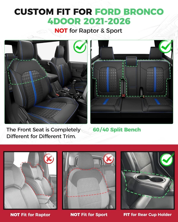 754Ford Bronco Seat Covers 4 Door 2021 2022 2023 2024 2025 2026, Custom Fit Leather Car Seat Cover Full Set, Luxury Waterproof SUV Interior Accessories, Black Blue NOT for Raptor Sport, Brand New in the Box/Sealed Sells for $260+tax on Amazon https://www.amazon.ca/dp/B0FB3KVXGH Features: 【Custom Car Seat Covers】: Precision cut and custom tailored to "2025 Bronco 4DR (Without Rear Cup Holder)" for a glove-like fit. Exclusively designed for Ford Bronco 4Door 2021 2022 2023 2024 2025, since they have the same or similar seat size. NOT Fit for Raptor Sport. 【Luxury Leather Design】: RIDEPOSH luxury car seat covers maintain original interior style, featuring high-quality NAPPA Leather. Breathable, ultra-soft, skin-friendly leather car seat covers front seats to make your journey more comfortable. 【Maintain Existing Functionality】: Specifically tailored to fit snugly all details of car seat covers for Ford Bronco 4 Door and ensure the full function, not affecting at all the use of airbag, armrests, safety belt, child safety Seats and seat adjustments. full wrap car seat covers front seats come with seat back organizer for improved user convenience. 【Superior Car Seat Protector】: These waterproof seat covers for Ford Bronco 4Door adopts a four-layer structure, providing exceptional protection capabilities to safeguard your car seats from coffee spills and pet scratches. It is also easy to clean, simply wipe with damp cloths to make your waterproof car seat cover looks brand new for years. 【Easy to Install】: RIDEPOSH for Ford Bronco 4Door SUV seat covers, comes with installation accessories set. Follow installation video and manual guide, RIDEPOSH car seat protectors are easy installed within 40mins. (Patience is required to achieve a snug fit)