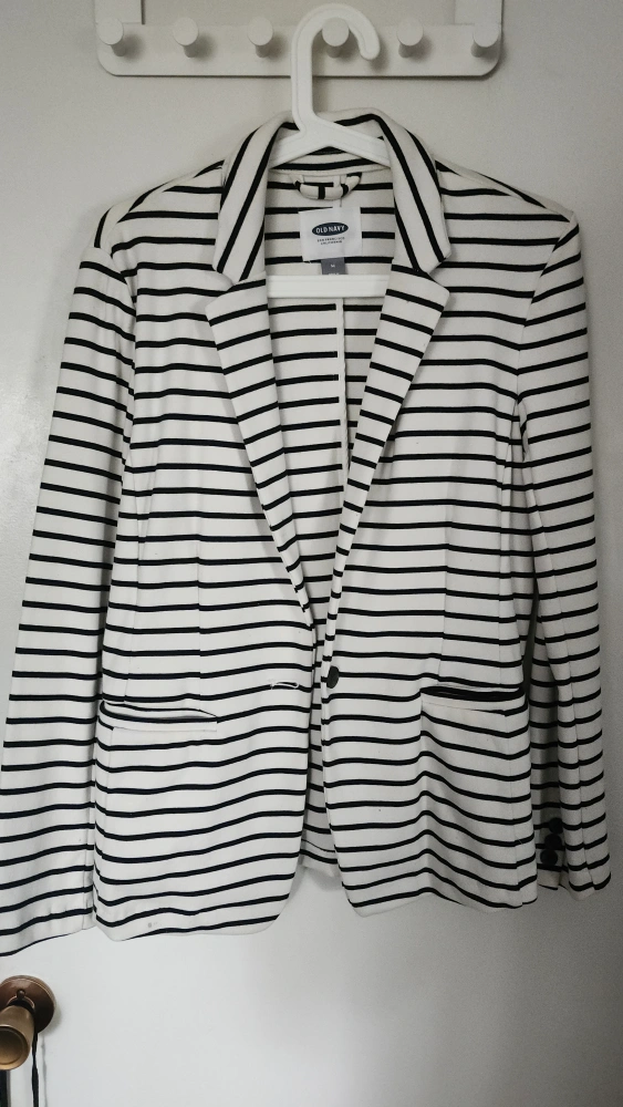 234Black and white striped blazer from Old Navy. Size medium. Has two pockets and one button. Only worn once or twice Pick up/cash only :)