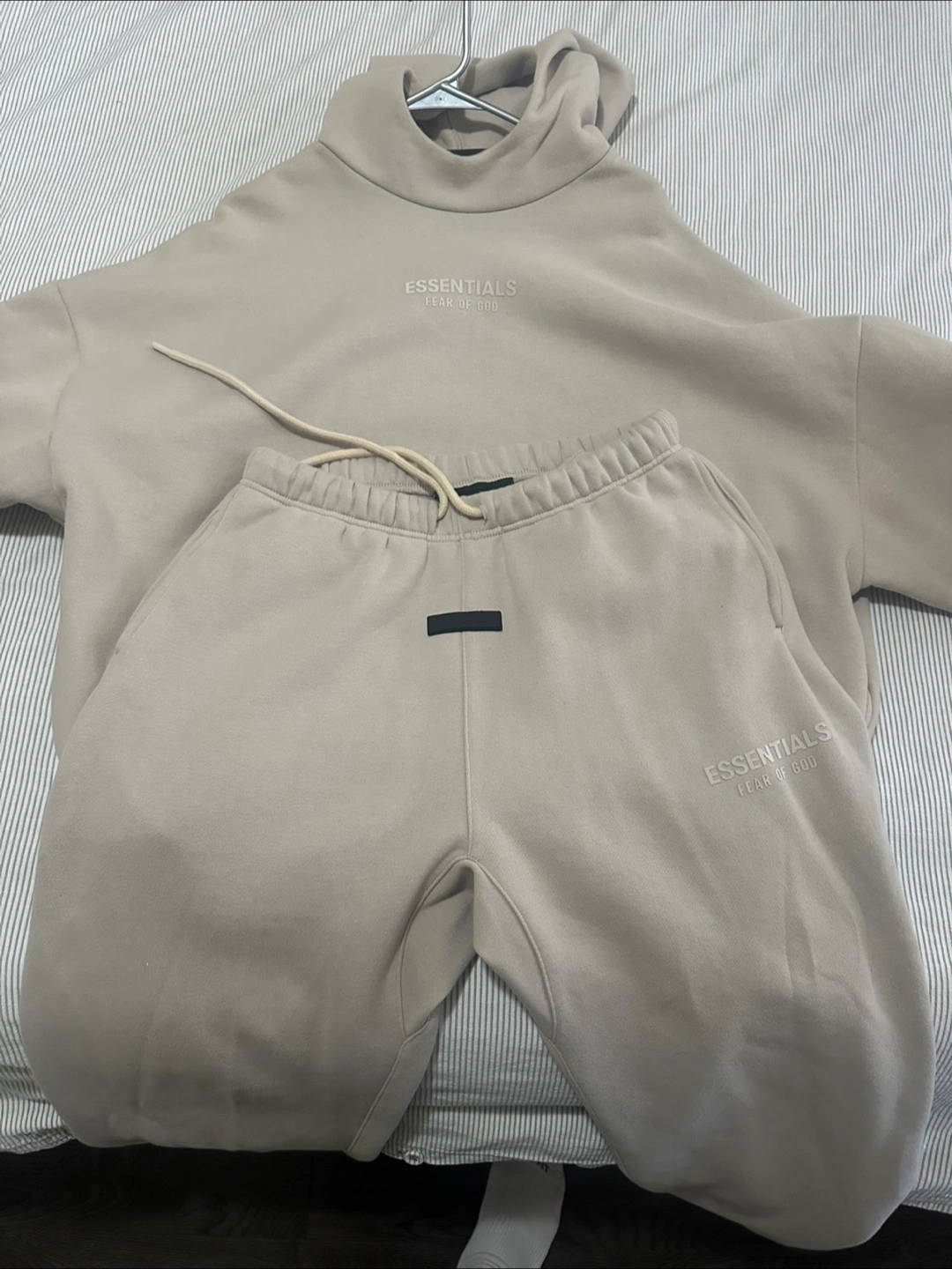 9Selling a comfy Essentials Fear of God matching set! The set includes a hoodie and sweatpants, both in a neutral colour. Perfect for lounging or casual wear!