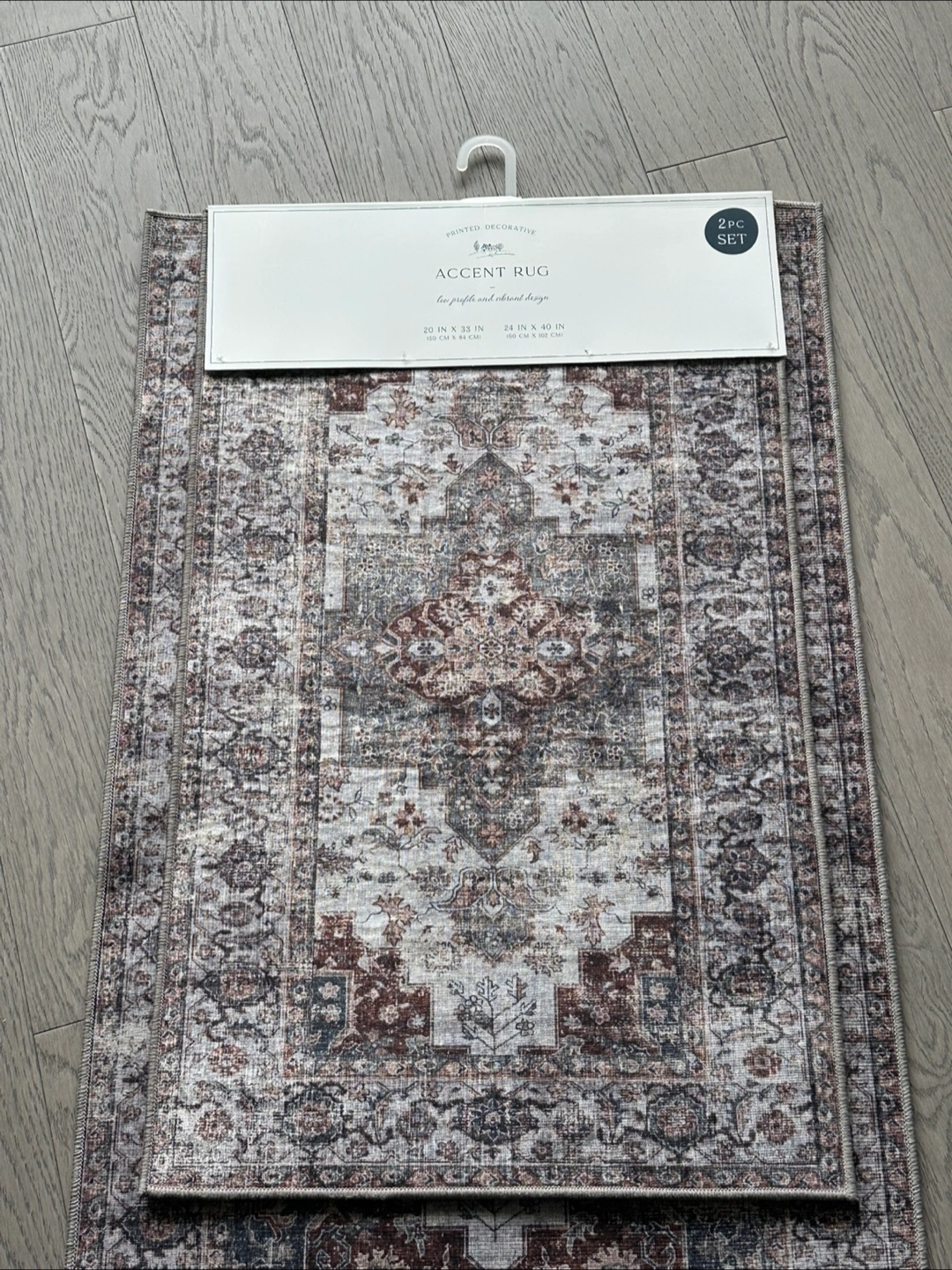 Selling a printed, decorative accent rug set. Didn’t fit my space but hoping they can find a good home! It includes two rugs with a low profile and vibrant design. The sizes are 20 inches x 33 inches and 24 inches x 40 inches