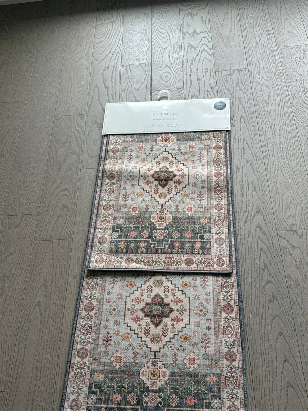 I'm selling a 2-piece accent rug set. The rugs feature a low profile and vibrant design. Didn’t quite fit my space but hoping they find a good home!