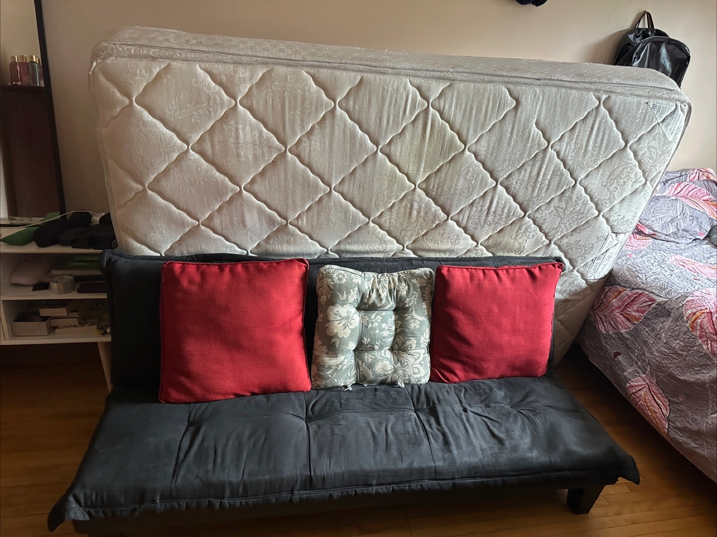 Selling a futon with a mattress and pillows. It's in good condition and ready for a new home! The futon has a black frame and comes with a white mattress and three pillows (two red, one floral).