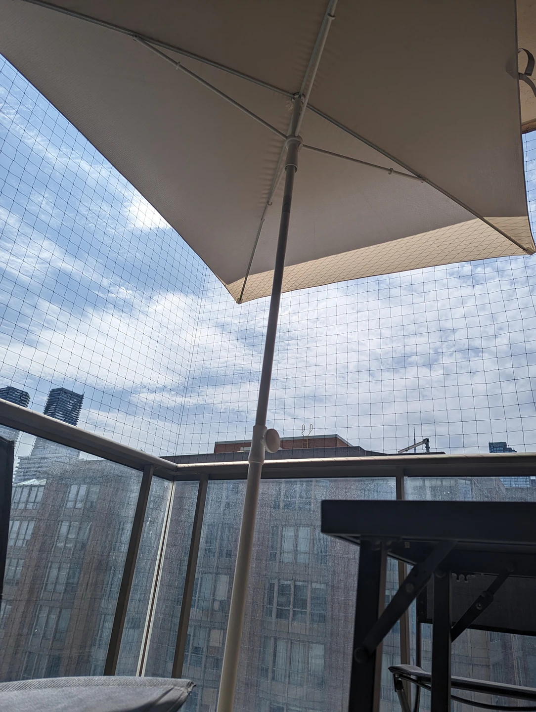 Tveto patio or balcony umbrella comes with Huvon stand plus umbrella cover to protect the umbrella from the elements. Grey/beige/white Tveto umbrella can be set straight or tilted at an angle to shade from the sun as it moves.