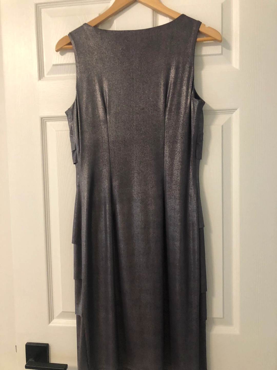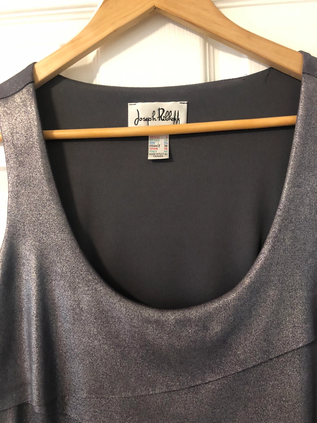 This is a Joseph Ribkoff dress in size 6. It's a beautiful dress that would be perfect for a night out or special occasion! It has a tiered design and a flattering fit.