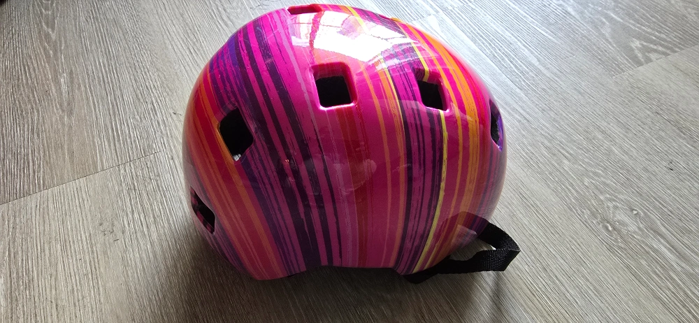 Here's a fun and vibrant bike helmet for kids! It features a colourful design with pink, purple, and orange stripes. Perfect for keeping your little one safe and stylish during their bike rides.