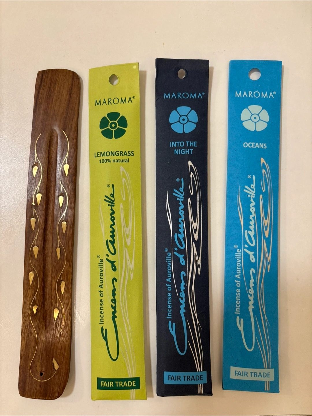 I'm selling a set of Maroma incense sticks with a wooden holder! Included are three scents: - Lemongrass - Into the Night - Oceans These incense sticks are 100% natural and Fair Trade