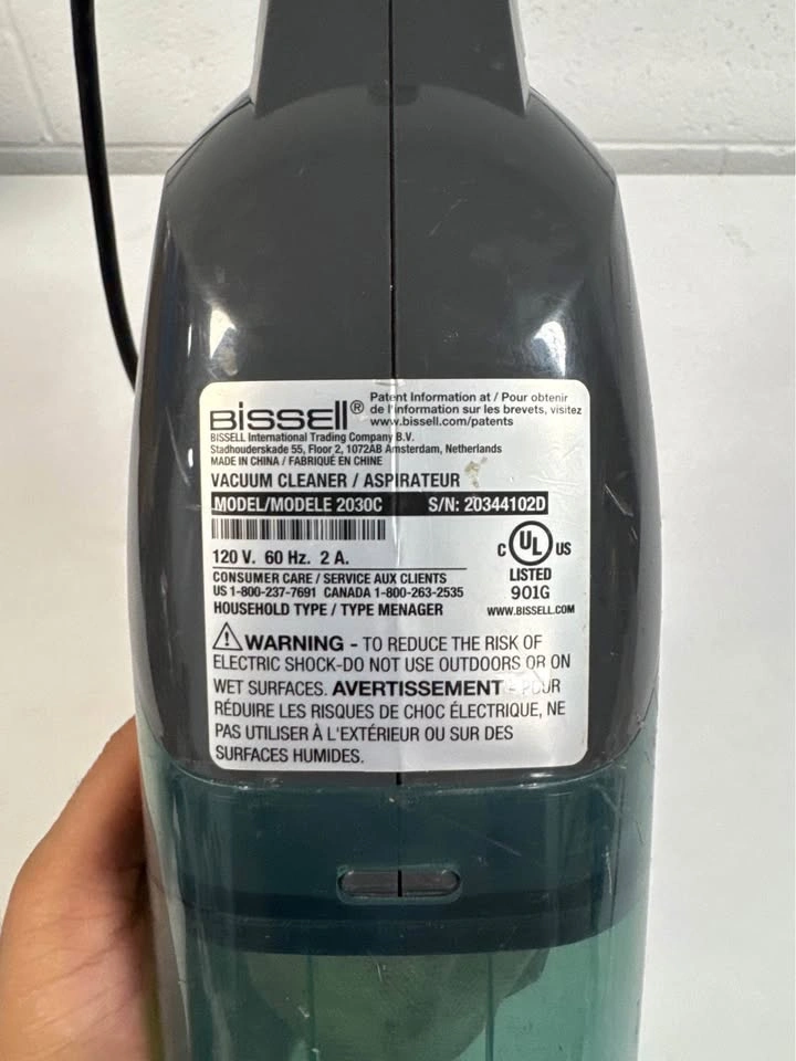Bissell Model 2030C handheld corded vacuum cleaner. Compact and lightweight, ideal for quick cleanups, cars, stairs, upholstery, or small spaces. Comes with a long cord for extended reach, easy one-button operation, and a clear dust container so you can see when it’s full. Works well and ready for use. Pickup in North york
