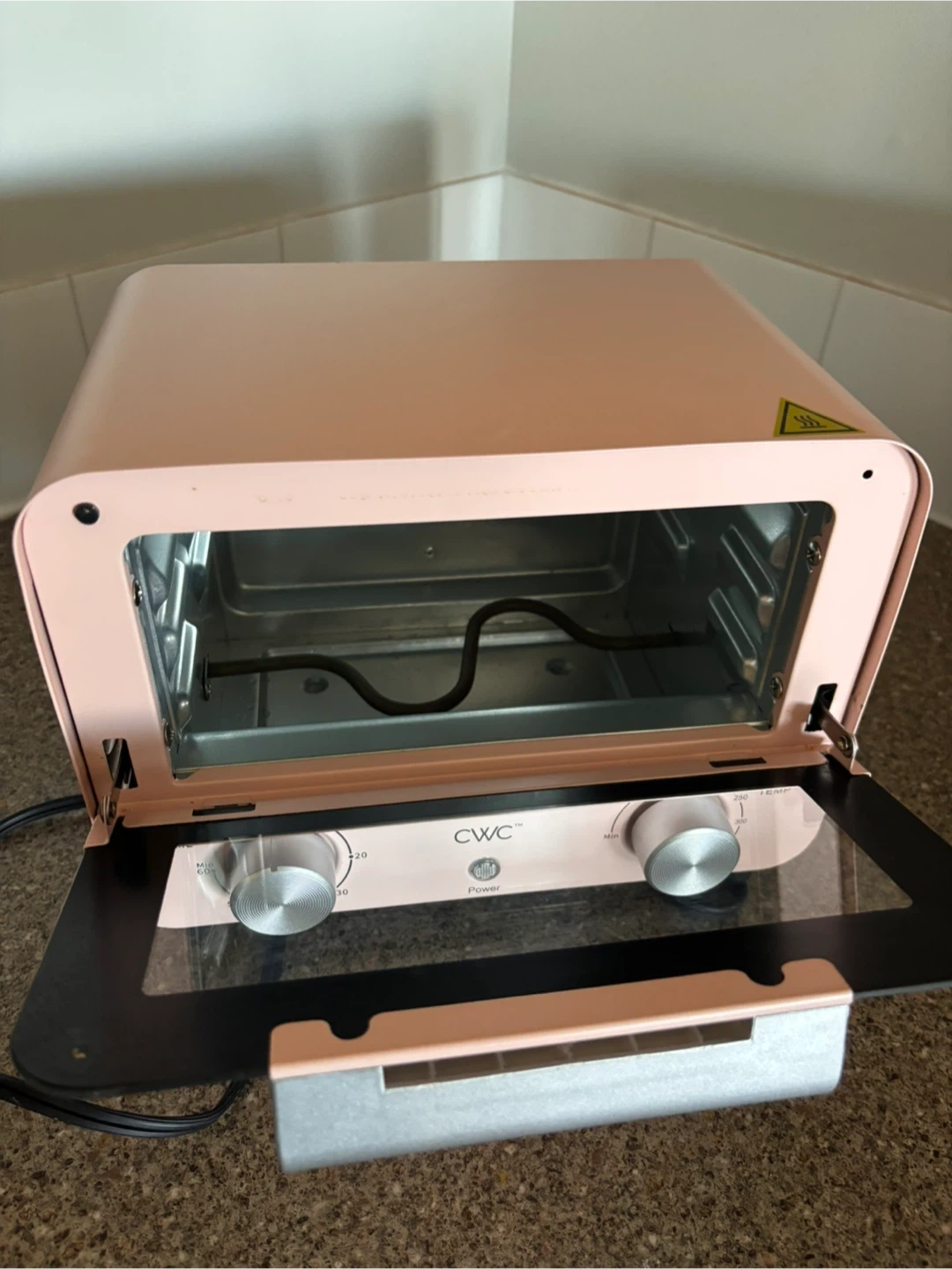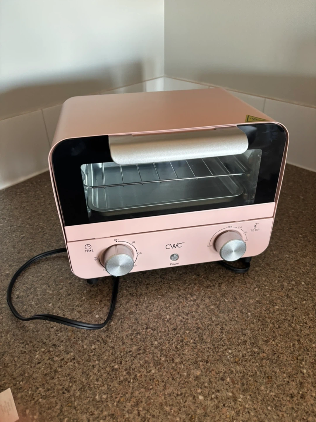 This is a CWC mini toaster oven in a lovely pink colour. It has two knobs for time and temperature control. The oven includes a rack and a baking tray. It's perfect for small kitchens or dorm rooms!