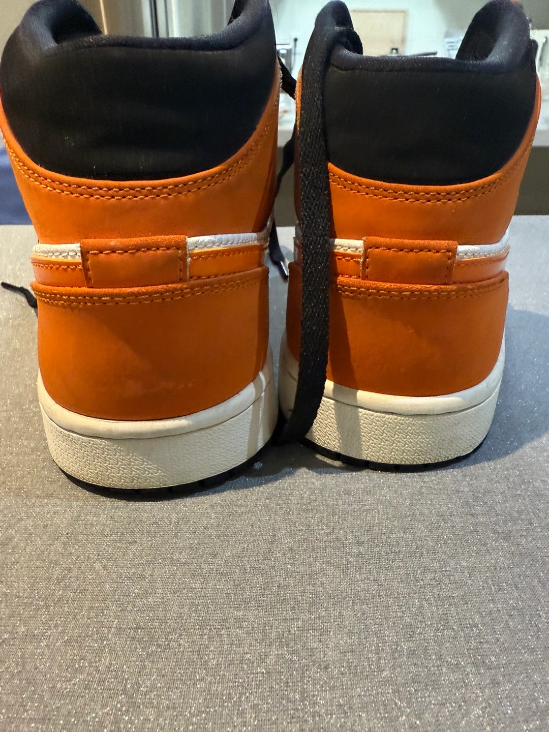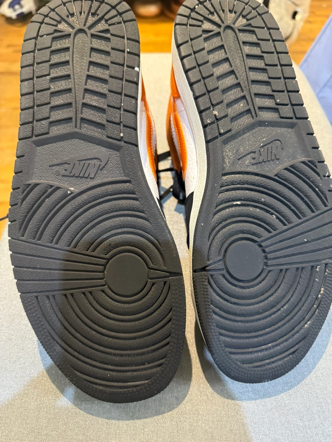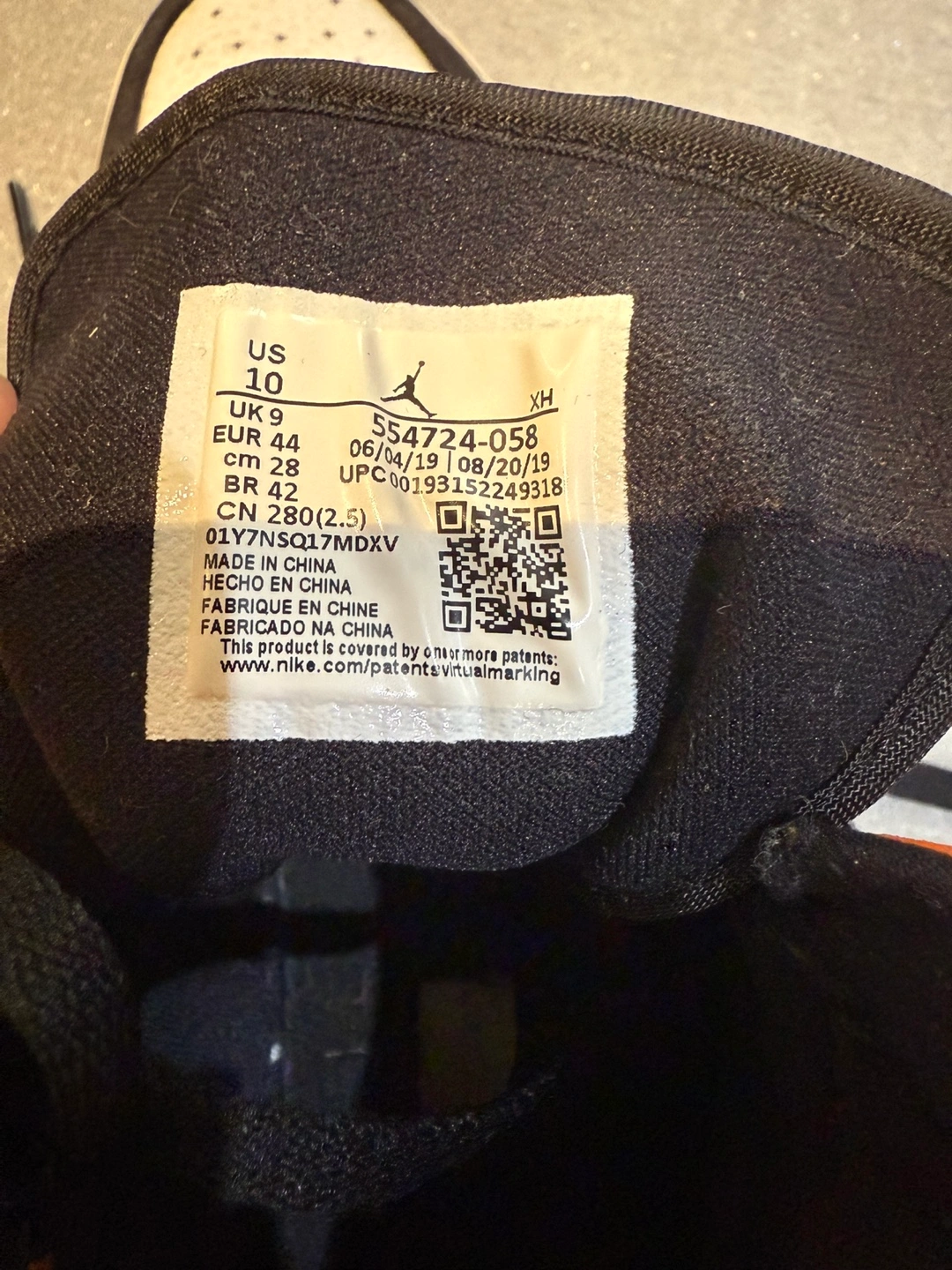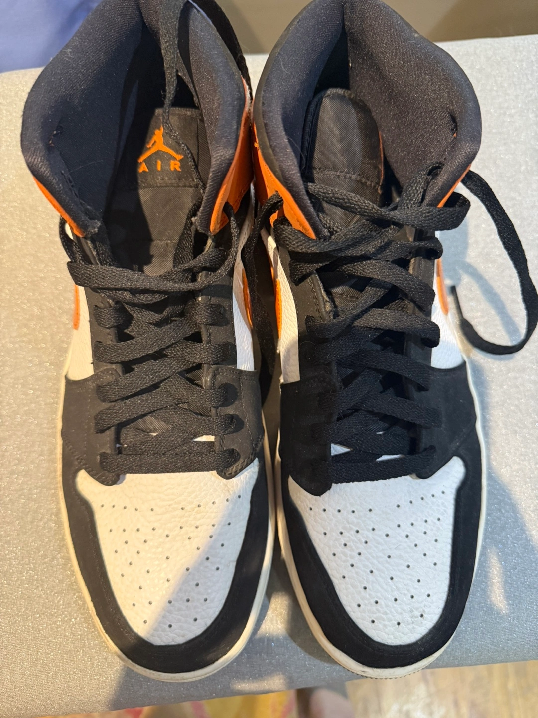 Selling a pair of Jordan Air 1 Mid SE sneakers in size US 10. These shoes feature a stylish orange, white, and black colorway. The manufacturing date on the tag is 2019 June 04. Just noticed a slight indent in the front. Definitely not visible. However, I will reduce the price to $50.
