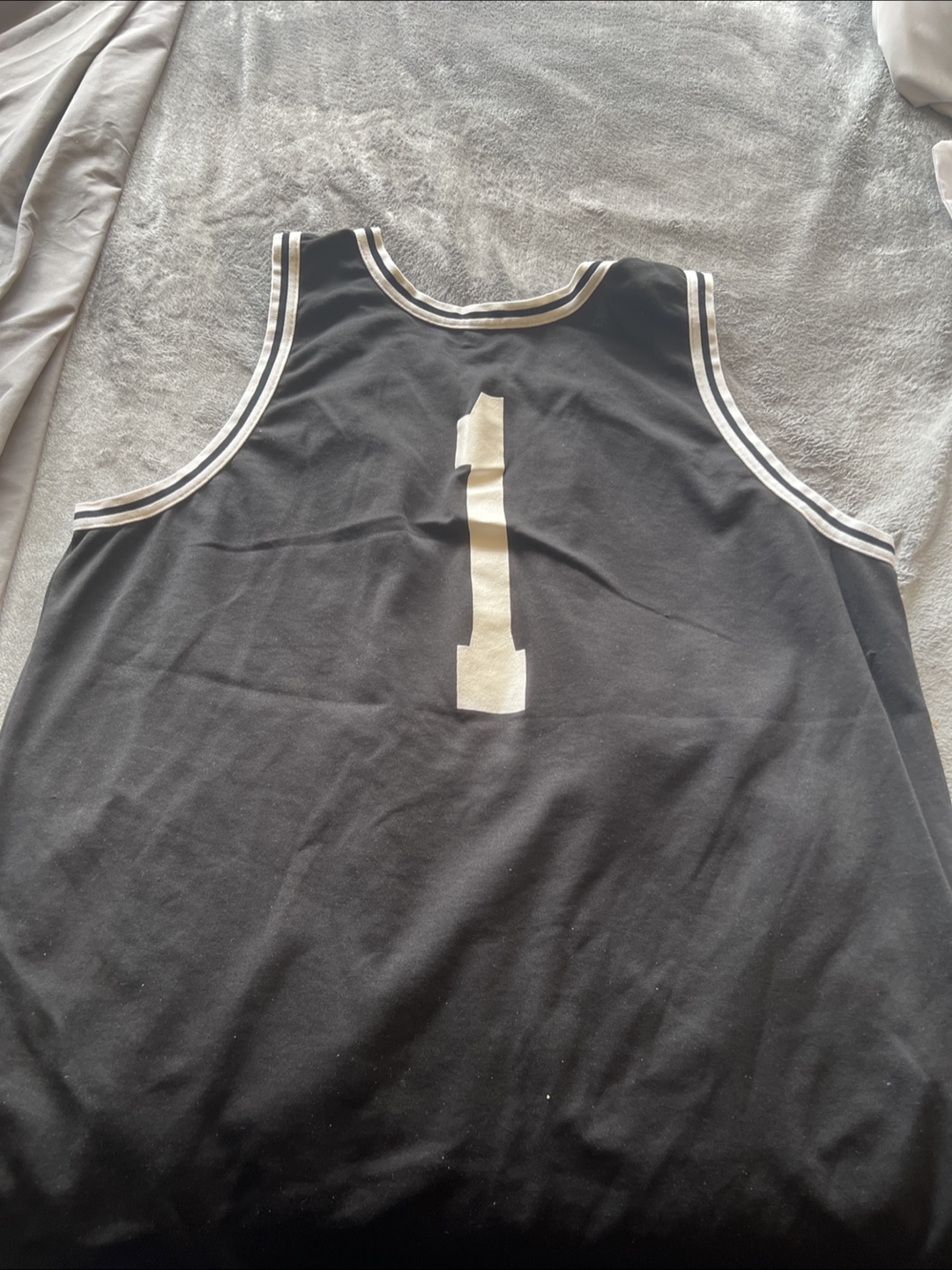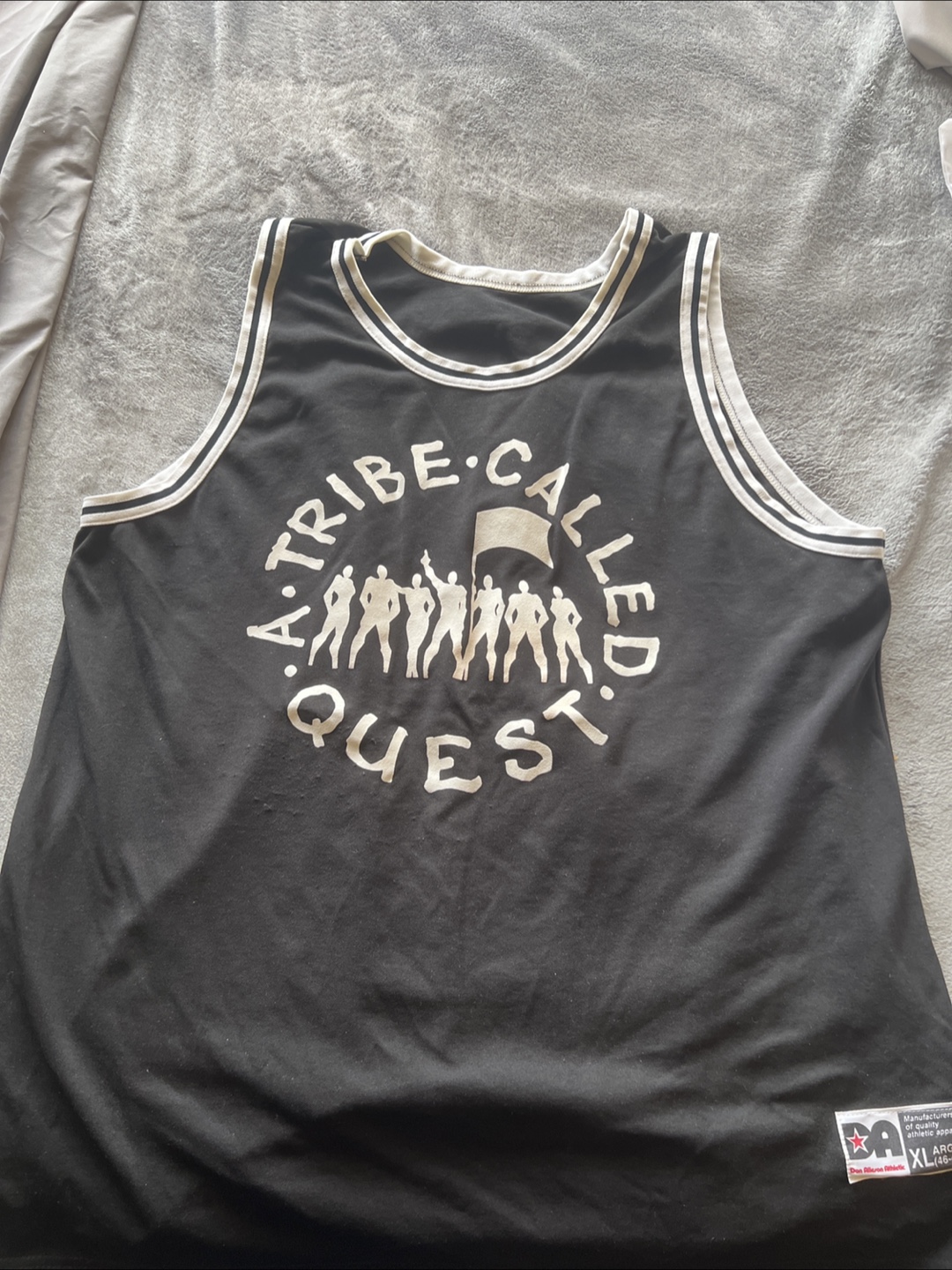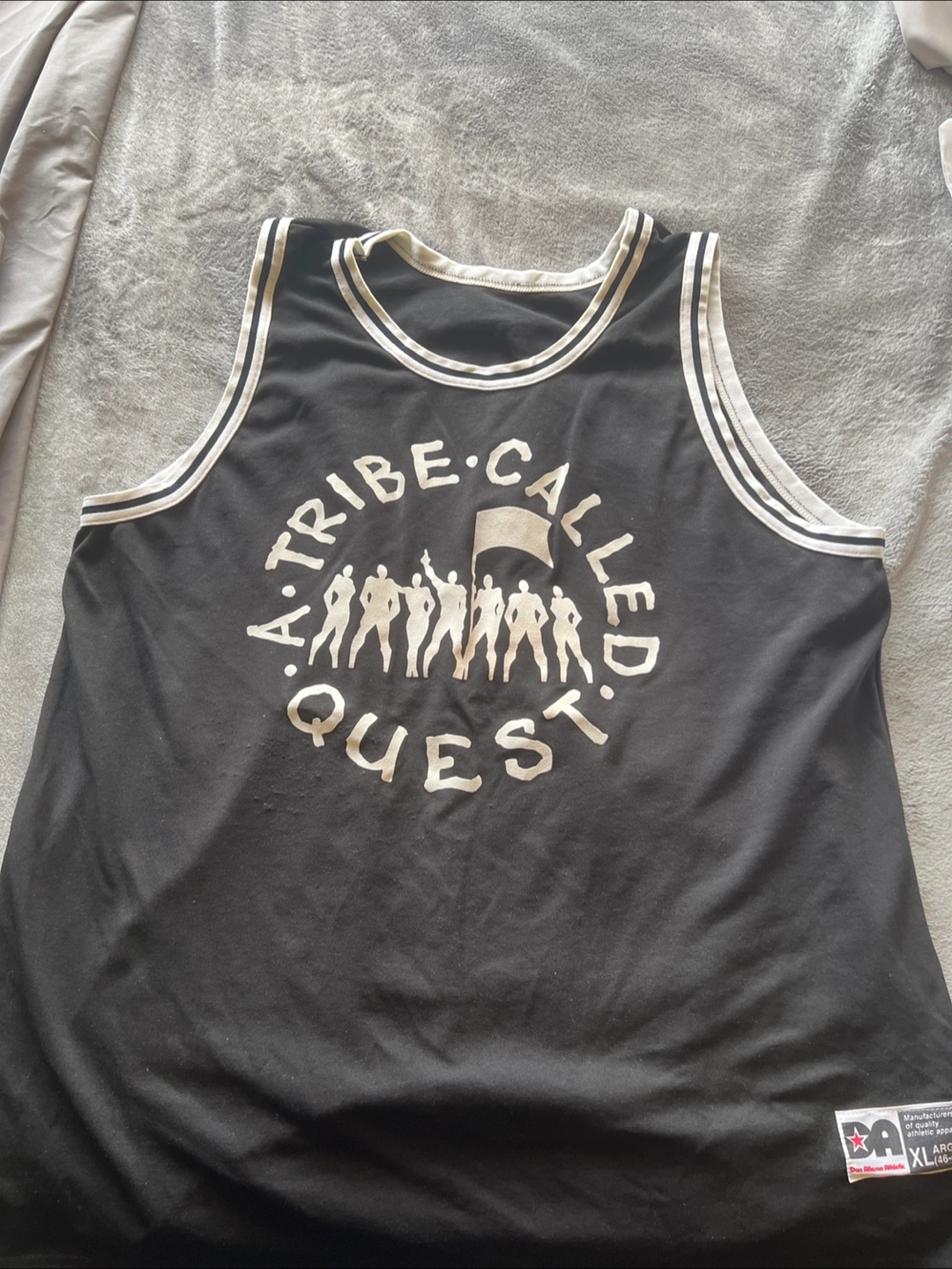 A Tribe Called Quest basketball jersey in size XL. It's black with white trim and the iconic group logo on the front. The number 1 is on the back. Great for any fan!