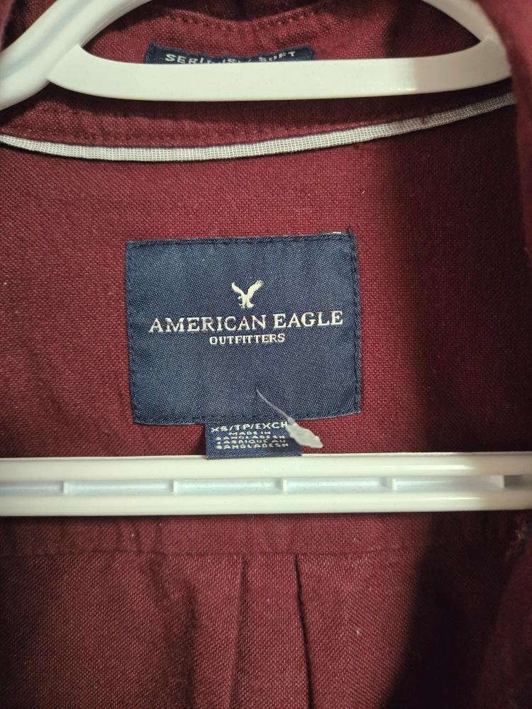 I'm selling an American Eagle Outfitters shirt in size XS. It is a burgundy colour and made of soft material. Perfect for casual wear!