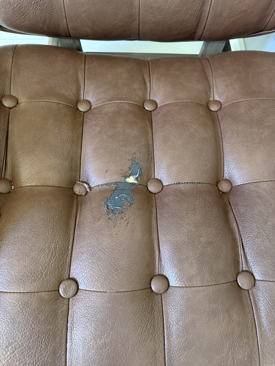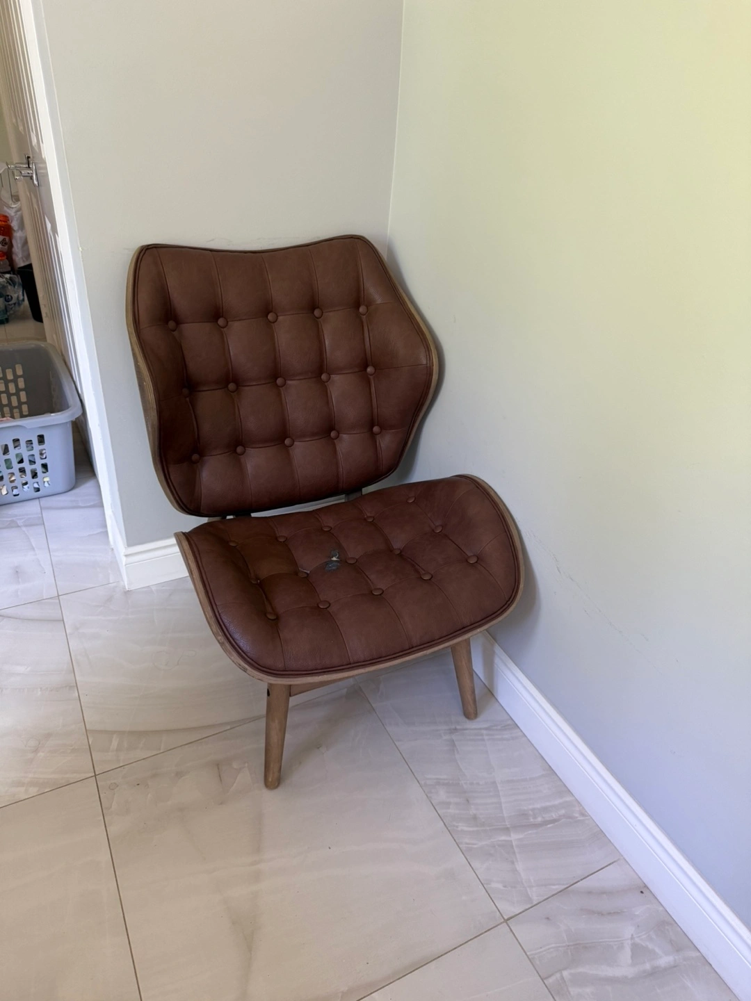 Selling a comfy brown leather lounge chair. It has a tufted design and a unique shape that would look great in any living room or den. Please note there is some wear and tear on the seat, as shown in the pictures. Still has lots of life left!
