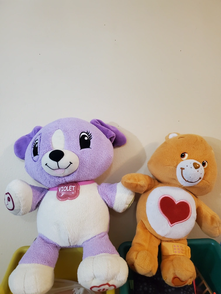 41Selling these two cute plush toys! One is a LeapFrog Violet plush. The other is a Care Bear plush with a heart on its tummy. Both are in good condition and ready for a new home