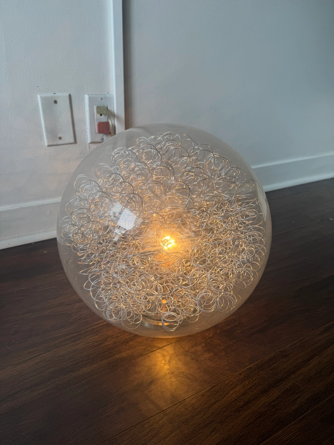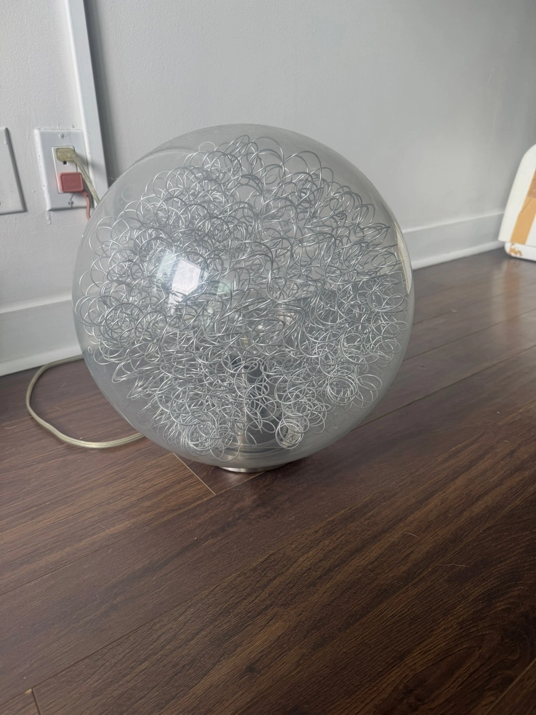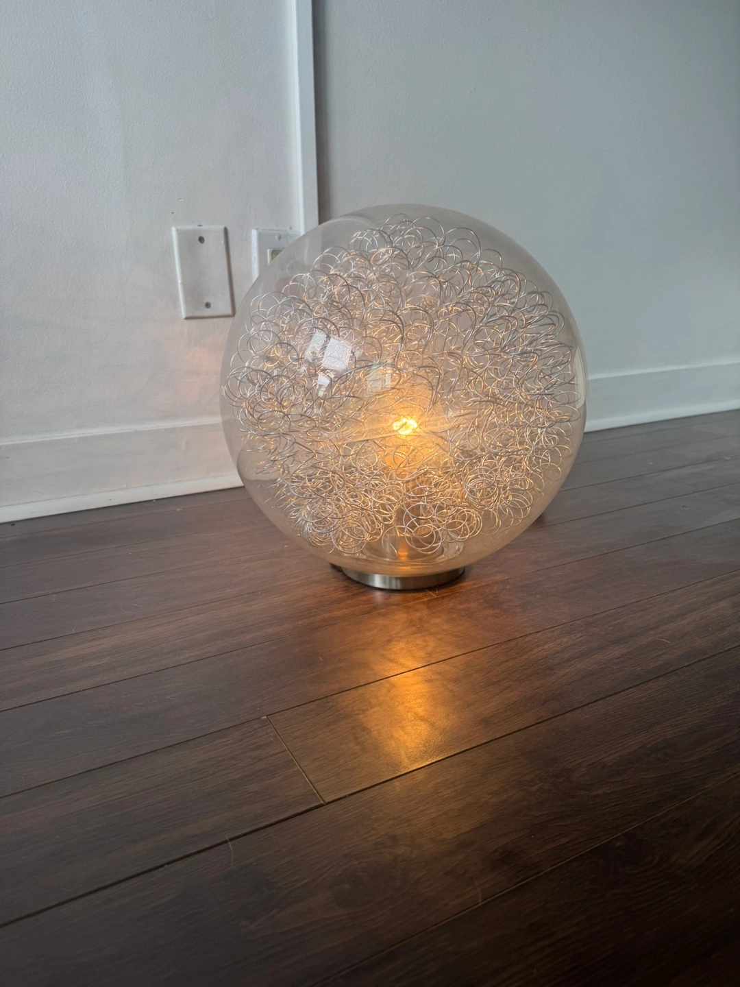 Selling a unique table lamp with a round, clear glass sphere filled with intertwined silver wires. It gives off a warm and inviting glow. Perfect for adding a modern touch to any room!