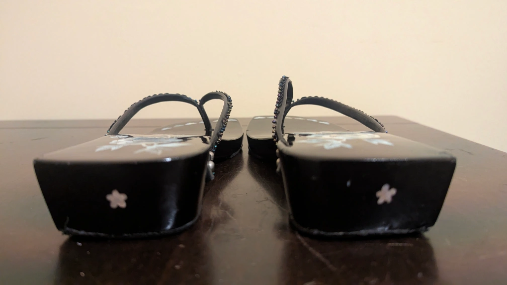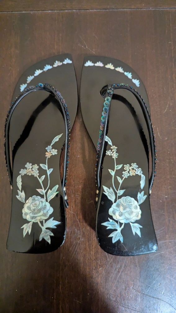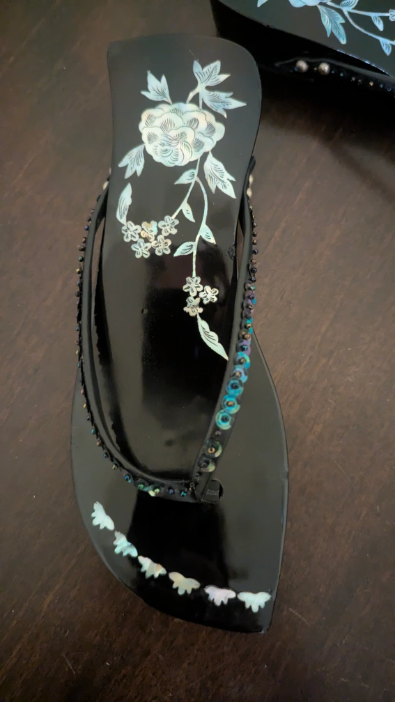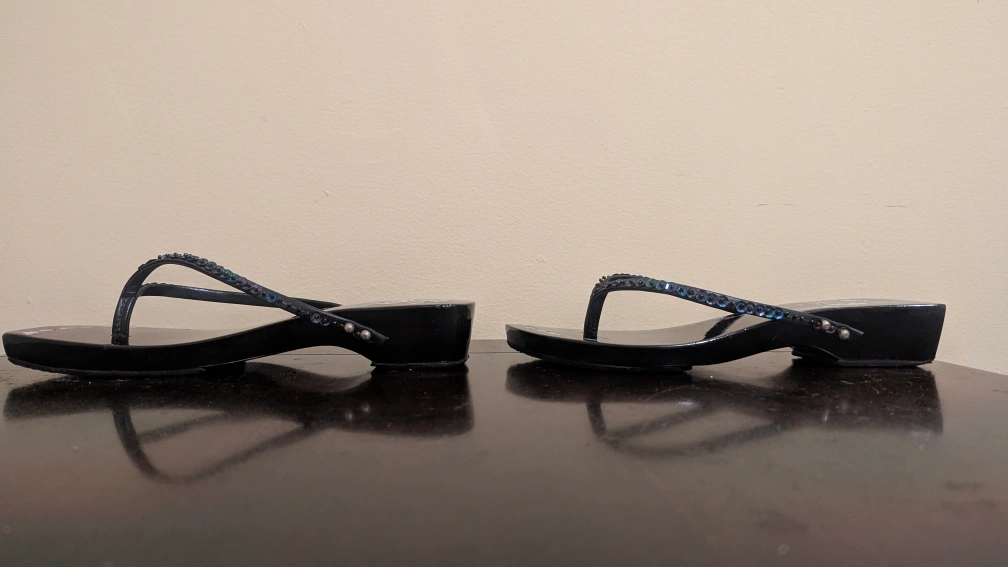These black thong sandals have a lovely floral design. They're perfect for adding a touch of elegance to your summer outfits!