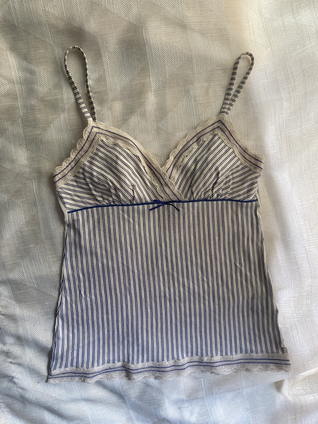 Romantic cami top with blue and white stripes! It has lace detailing around the neckline and bottom hem. Adjustable straps.