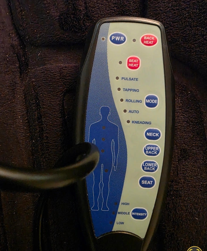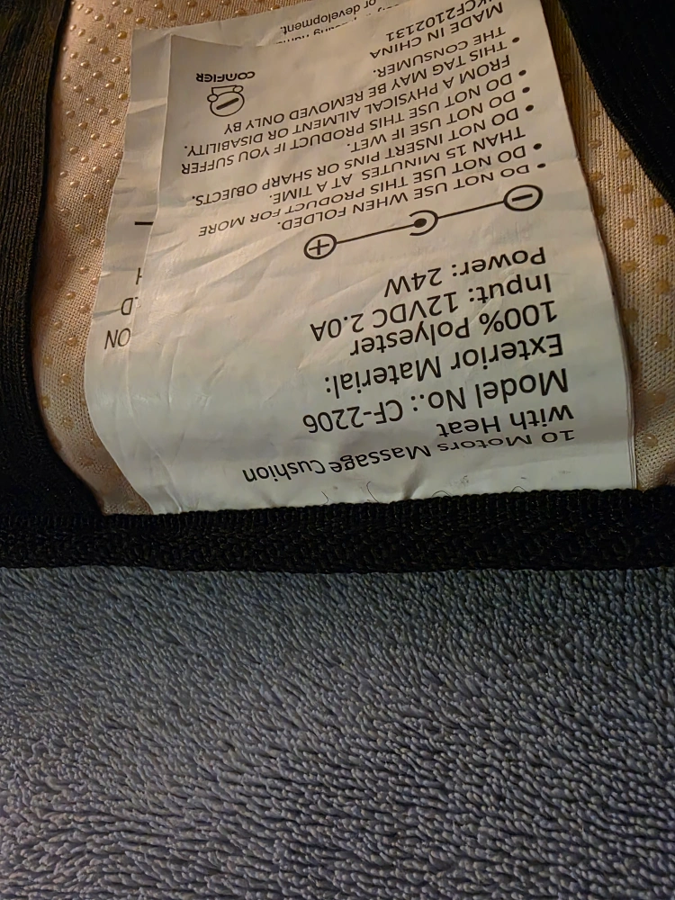 I'm selling a massage cushion with 10 motors and heat. The model number is CF-2206. It's made of 100% polyester. It requires an input of 12VDC 2.0A and has a power of 24W. It has a remote to control the massage and heat settings