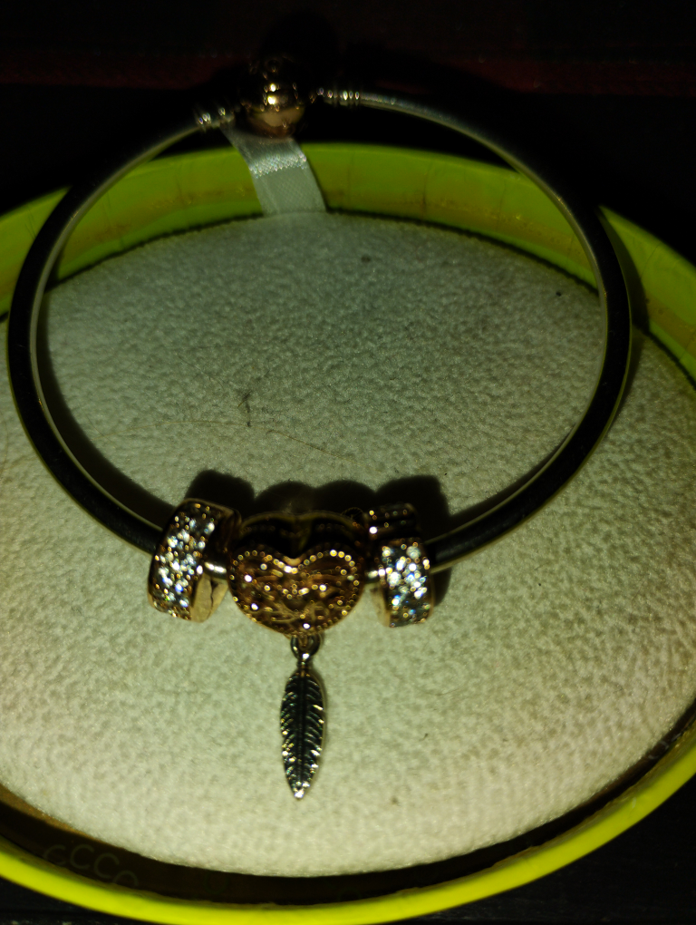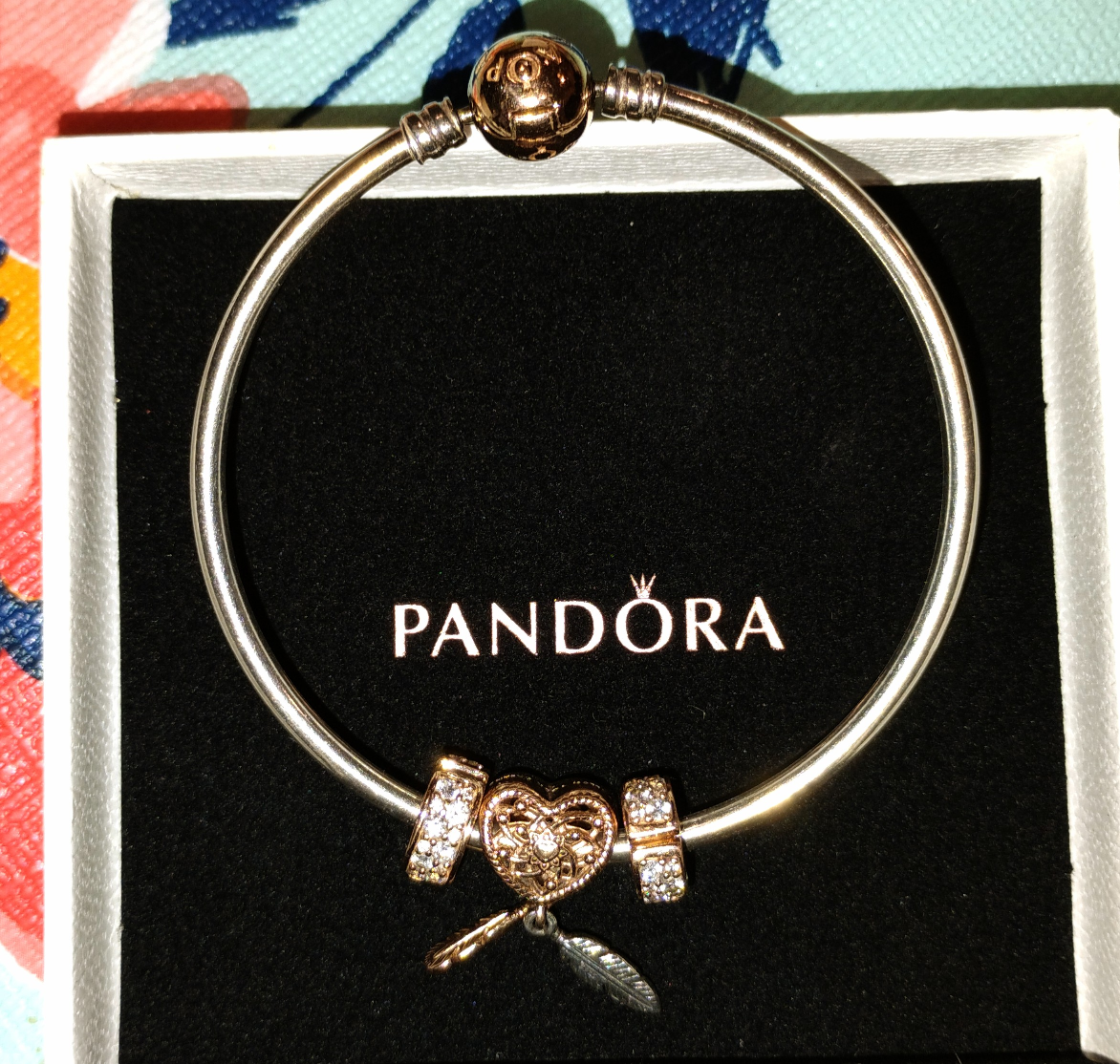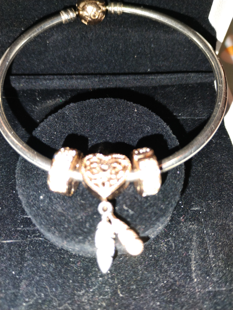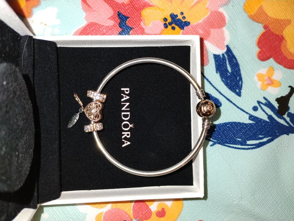 Selling a Pandora bracelet in excellent condition! It comes with a few charms as pictured. The bracelet is silver and rose gold and comes with its original box.