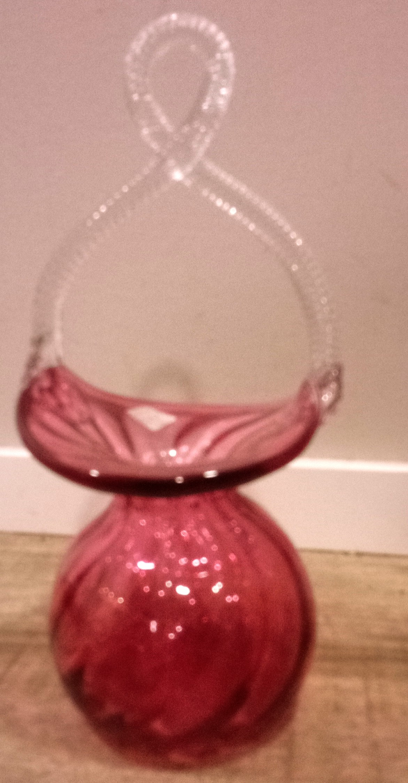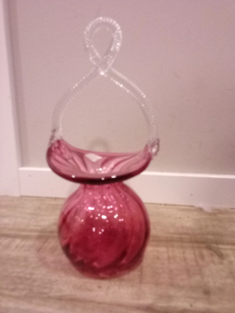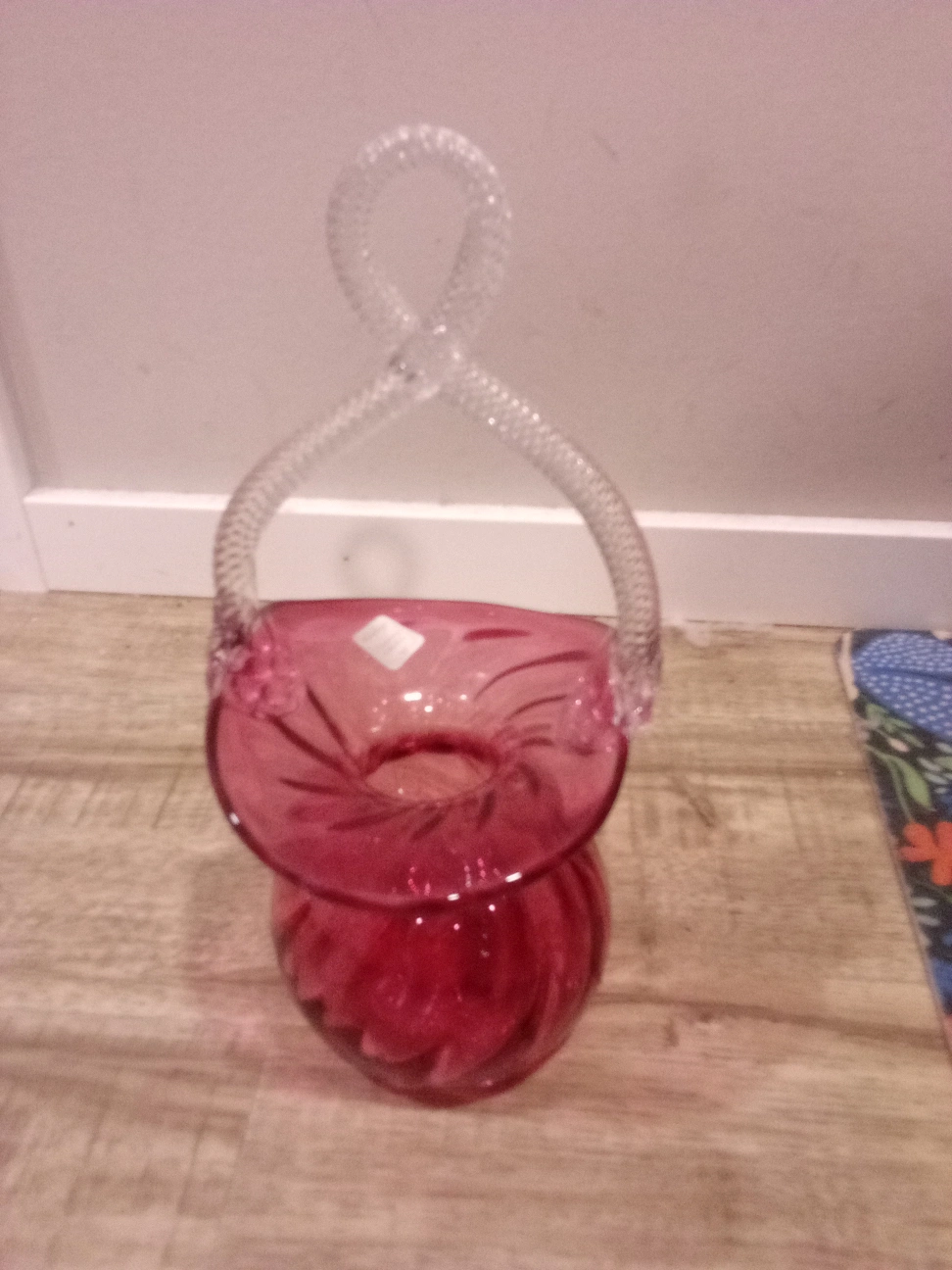 Selling a beautiful pink Heritage glass basket vase. It's in excellent condition and would make a lovely addition to any home!