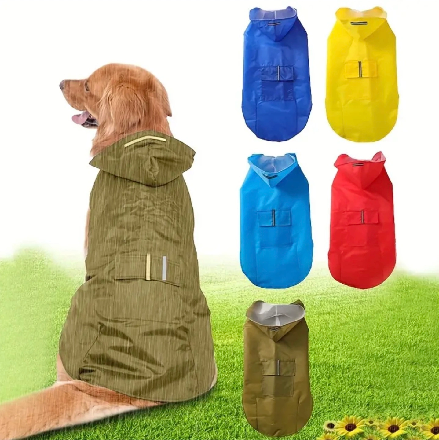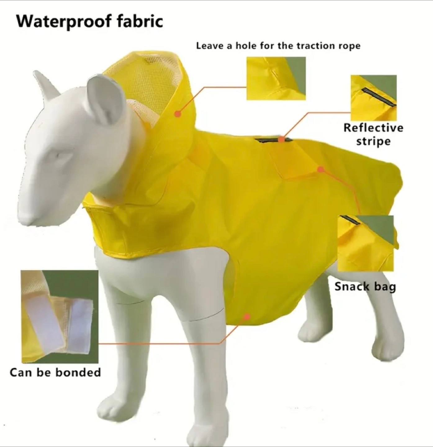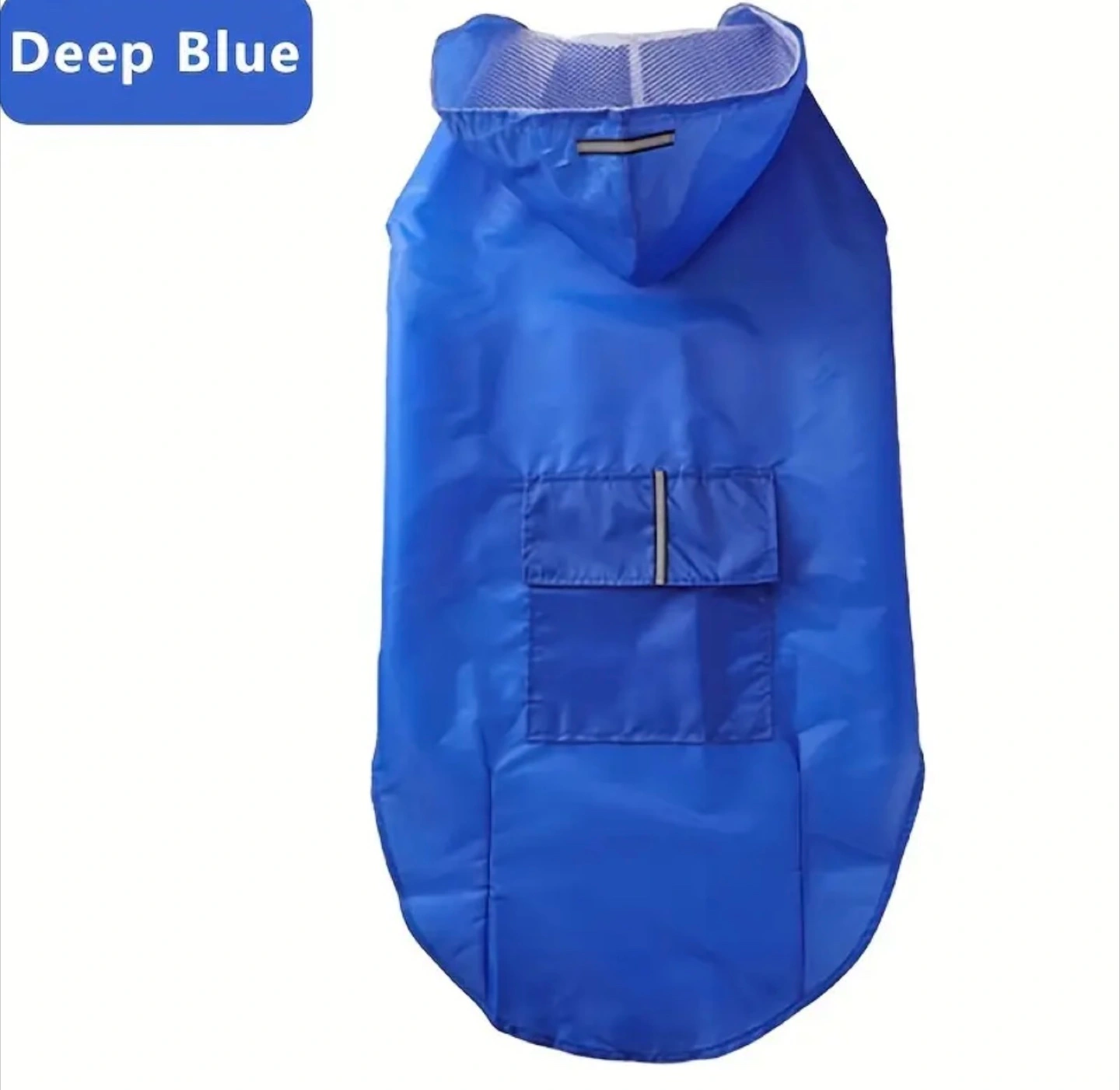 63Keep your furry friend dry with this dog raincoat! It features a waterproof fabric, a hole for the traction rope, and a reflective stripe for added safety. It also has a handy snack bag and can be bonded securely. Size is 3XL and the colour is deep blue