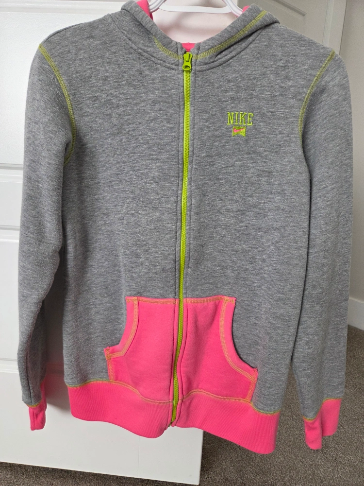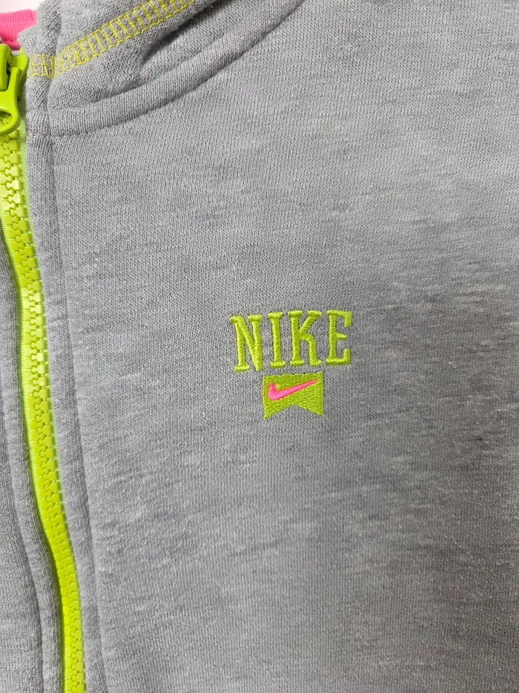 Selling a Nike zip-up hoodie in size XL. It's a grey colour with pink and lime green accents. Perfect for layering!