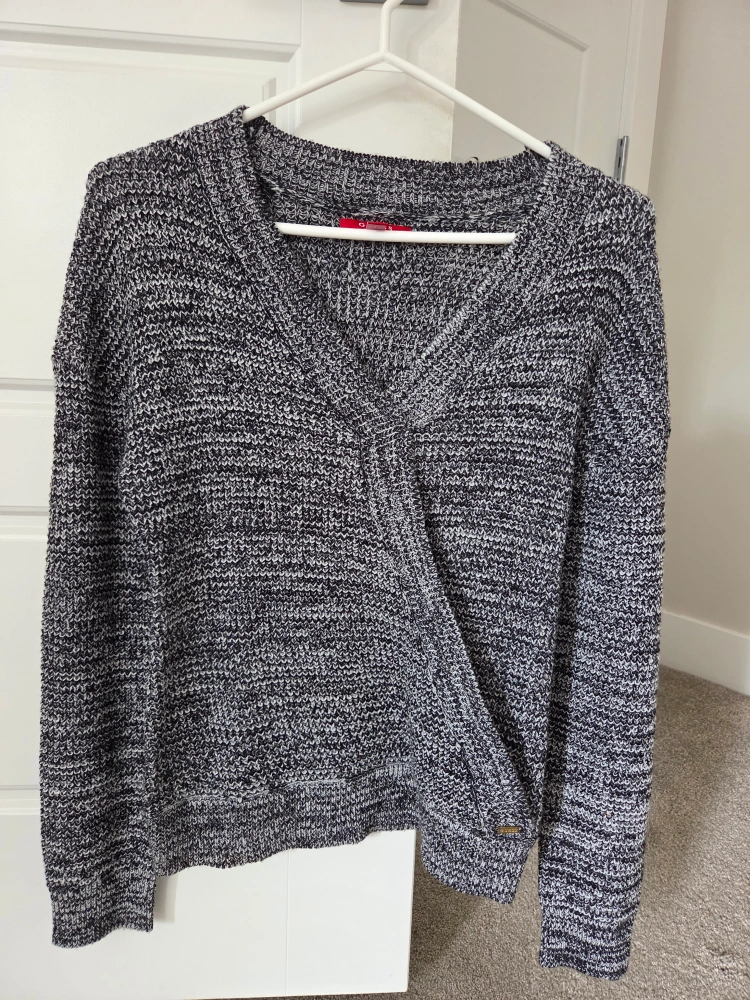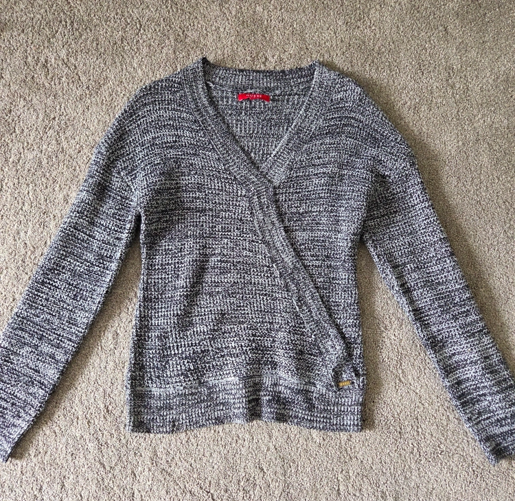 Cozy Guess wrap sweater in a size small! It's a stylish and comfortable piece perfect for layering. The sweater features a flattering wrap design. Made in Bangladesh.
