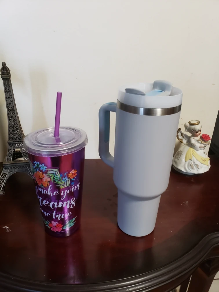 Never used.Selling two tumblers, one purple floral design and the other is a larger grey tumbler with a handle. Both are in great shape and ready for your favourite beverages