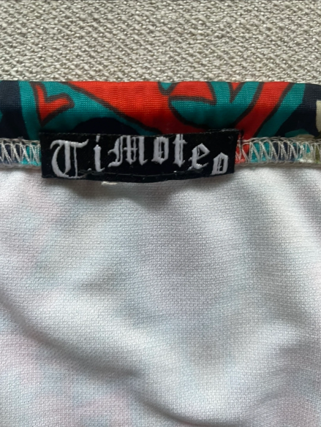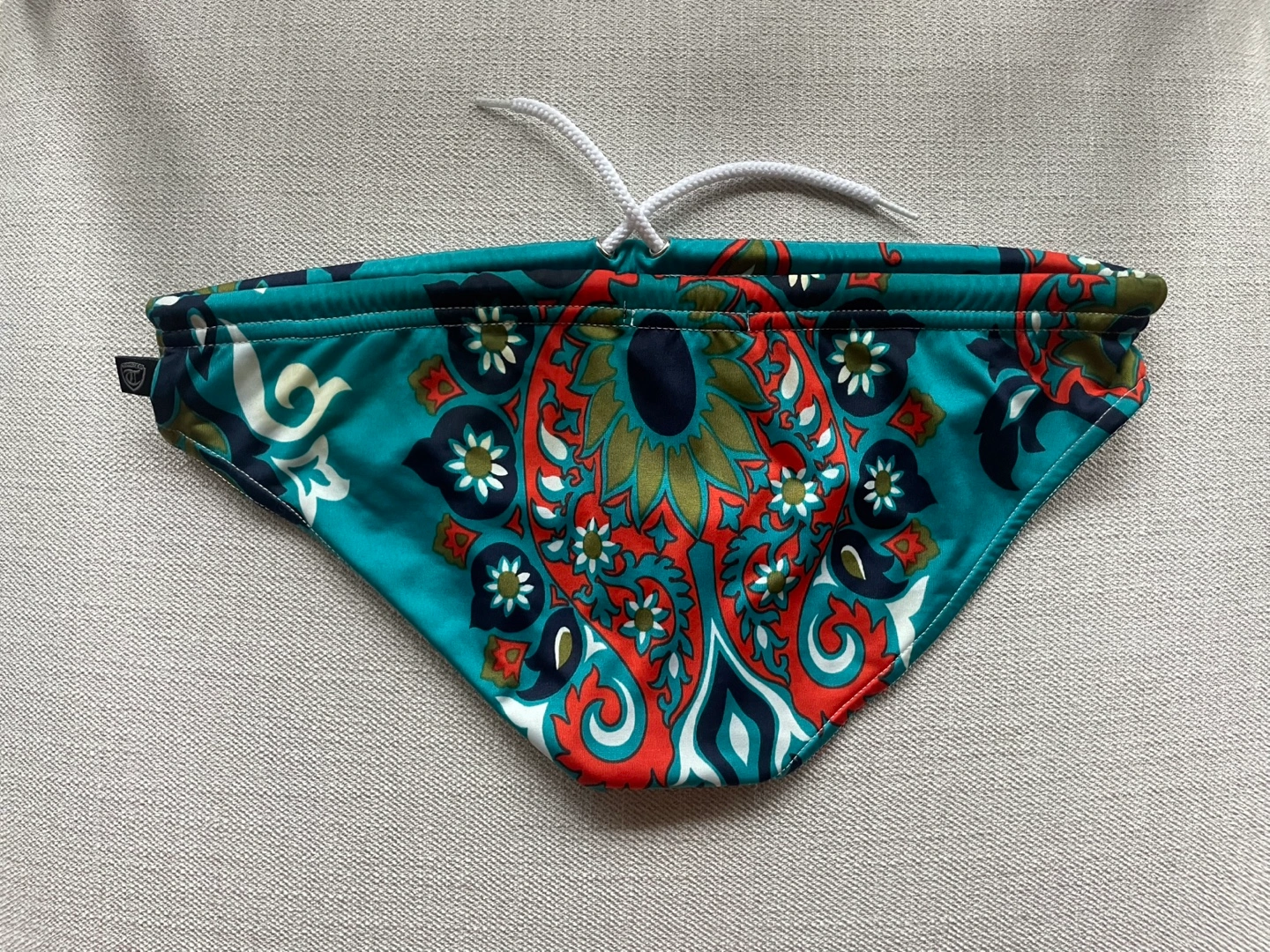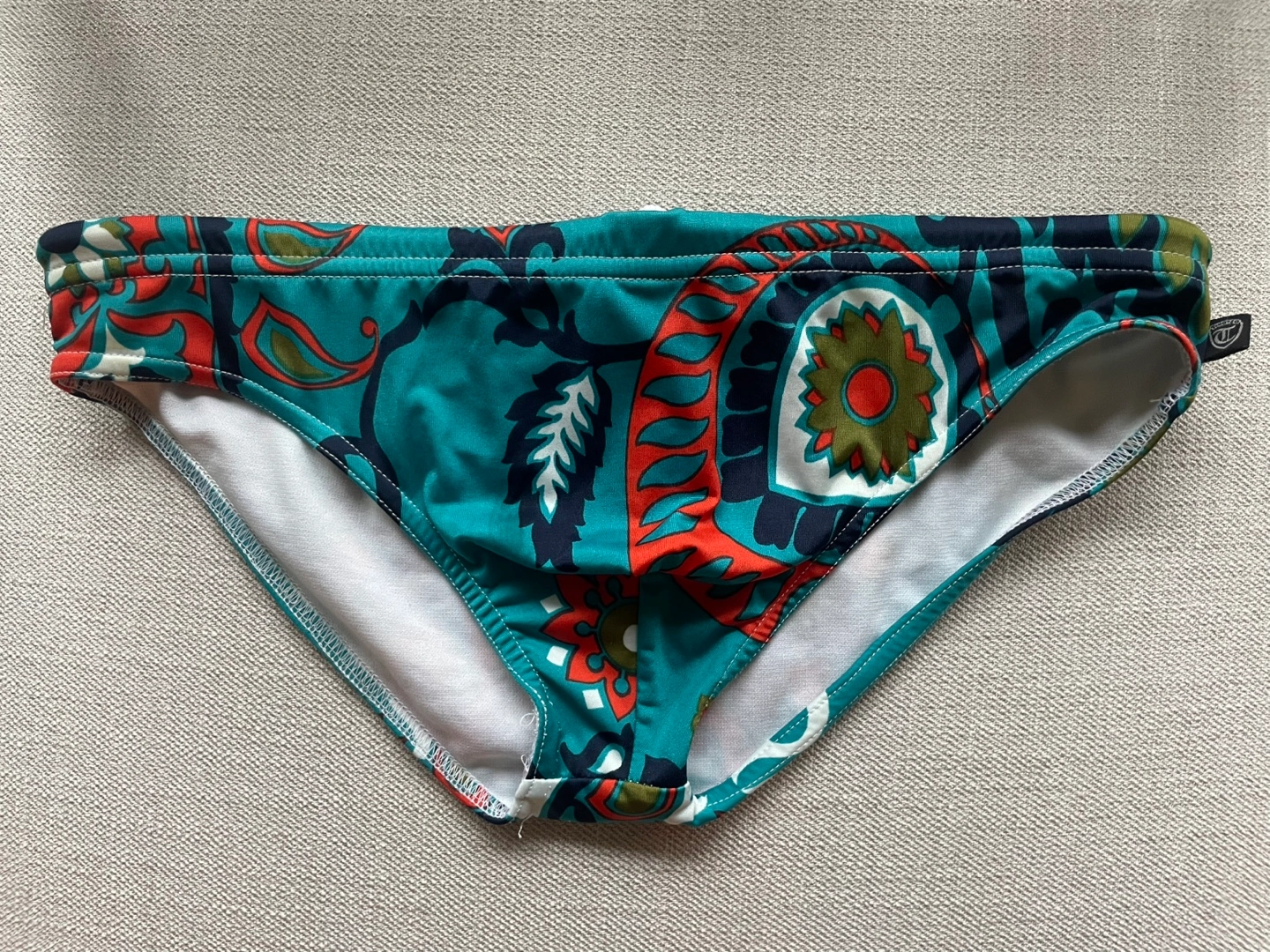 Selling a pair of Timoteo swim briefs in size small (close to a medium). The briefs feature a vibrant teal, orange, and navy paisley pattern. They're in great condition and ready for the pool or beach!