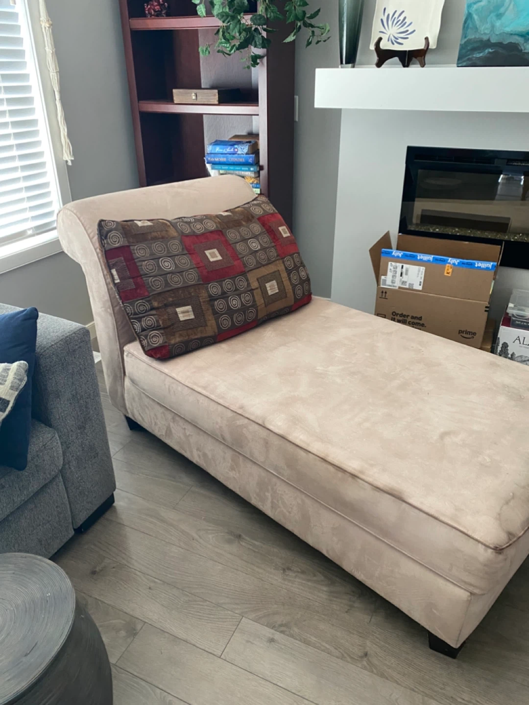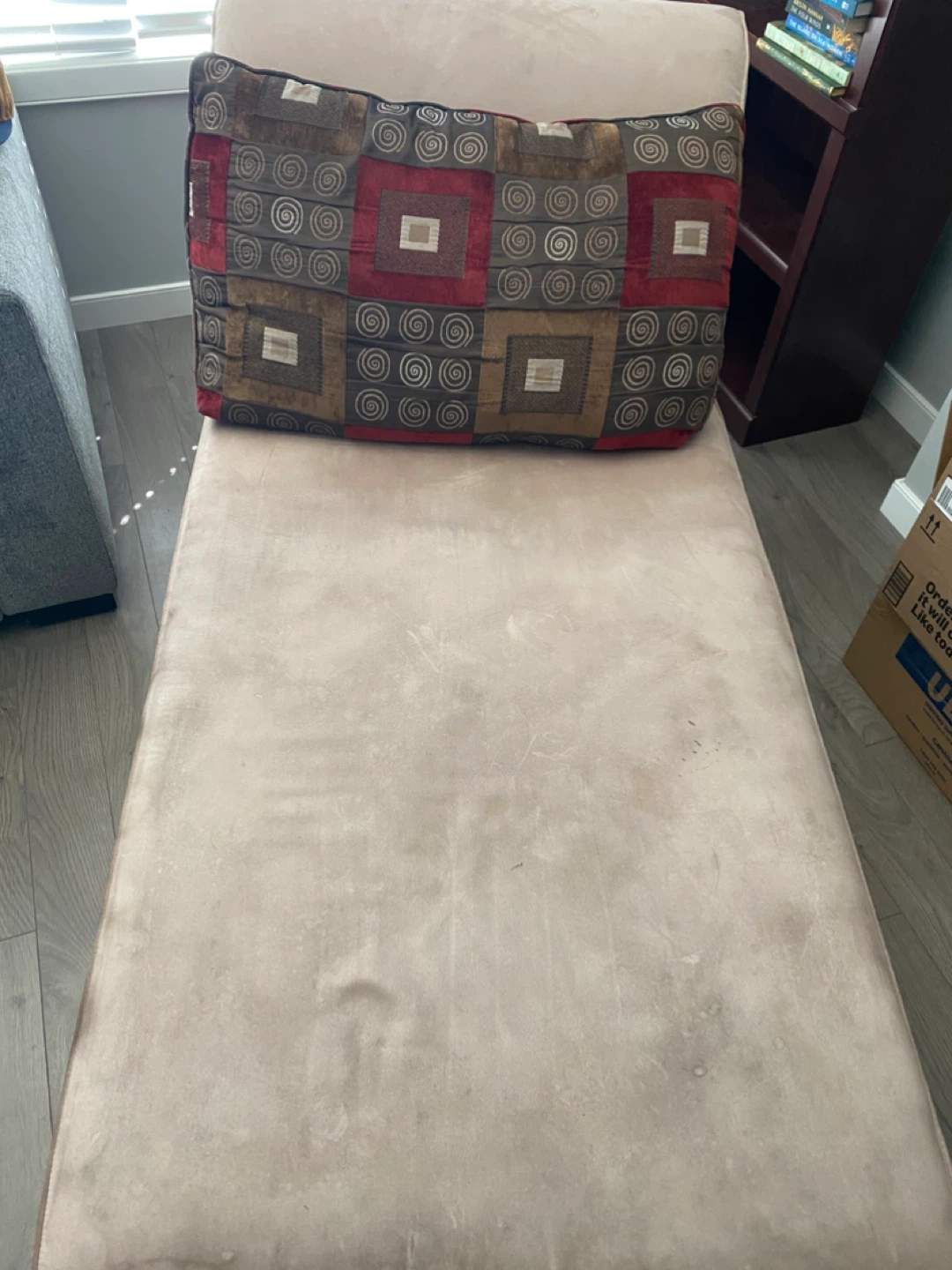 Tan microfibre chaise lounge in used condition. There are some water marks on the fabric, but I’ll give it another try with the steam cleaner. Small area of scratches shown in pic#3. Lots of life left in it. From a dog-friendly home. For pick up in Auburn Bay SE.