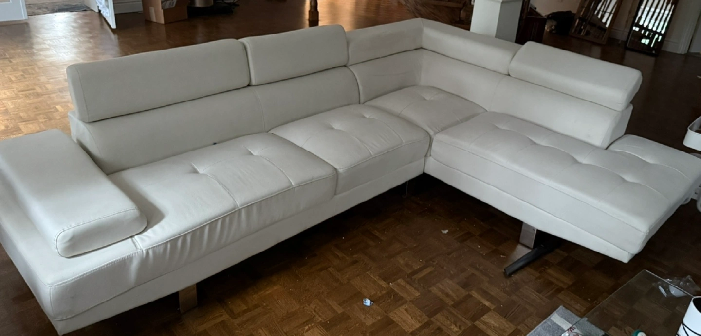 Here's a stylish white leather sectional sofa that would look great in any living room! It's in OK condition and super comfy for lounging. Fabric shows some damage and may need to be upholstered.