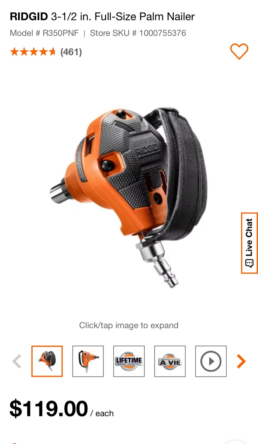Buy & SellRidgid R350PNF Palm Nailer3-1/2 in.(Tool Only)Ridgid R350PNF Palm Nailer3-1/2 in.(Tool Only)$50Selling a Ridgid palm nailer. It's in good condition and ready to go for your next project! This is the R350PNF model.ConditionLike newWHERE TO MEETCheck LocationView MapSELLERverifiedJCRexdale1528 reviews0 chats·0 favorites·12 viewsSEND CHAT TO SELLERHi JC! I’m interested in your listing.Hi JC! I’m interested in your listing.Get the Karrot app to chatSign In to chat