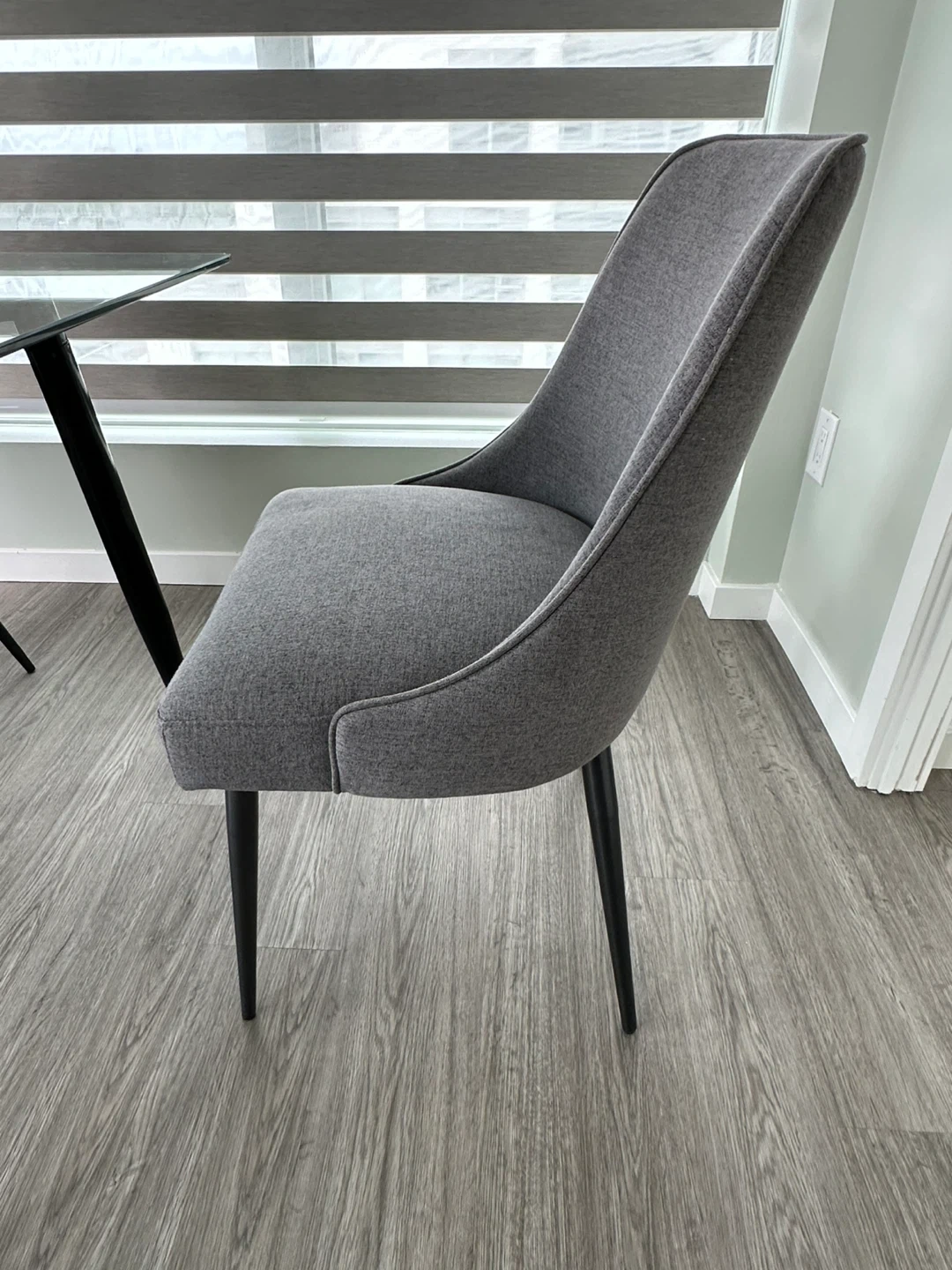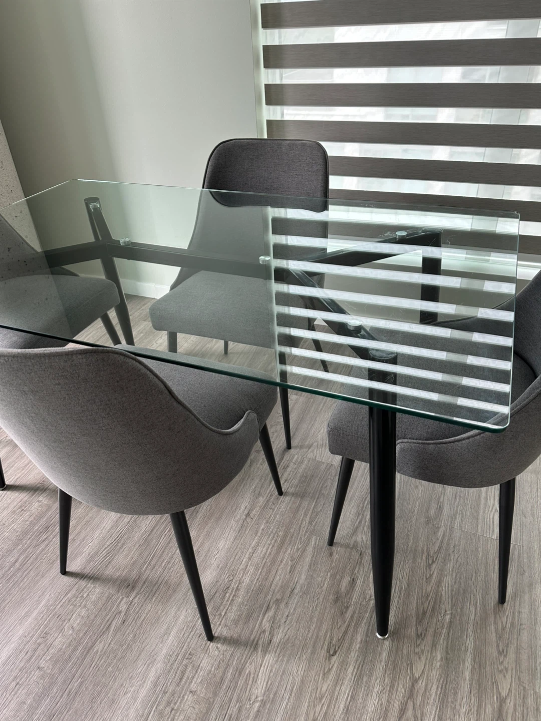 Selling a stylish 4 grey upholstered dining chairs and table.It's in great condition like new. The fabric has a nice texture and the chair has a sturdy build. Some scratches on the glass of table