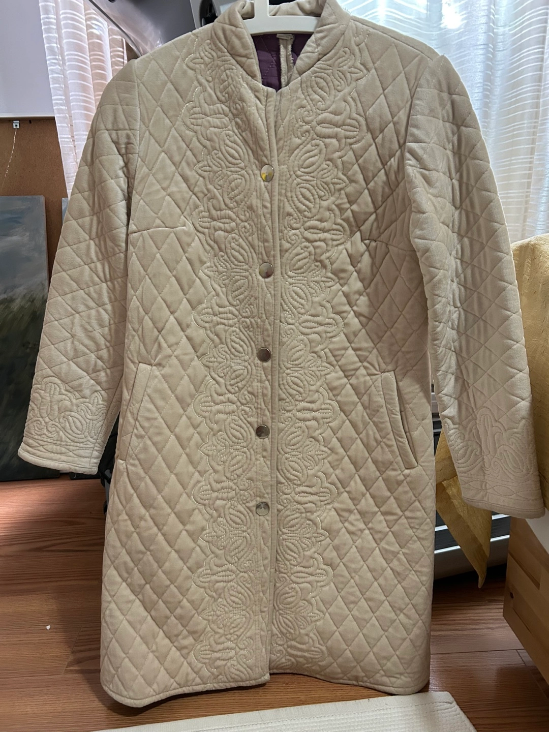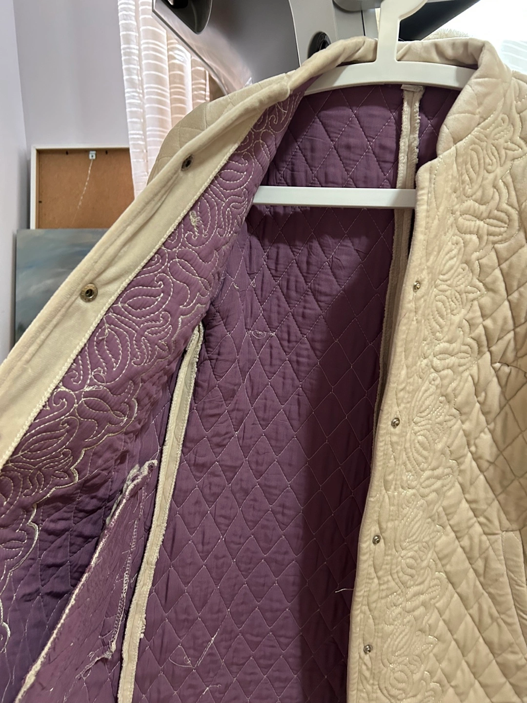 Quilted Velvet Jacket – Cozy & Warm Stay stylish and comfortable with this cream-colored quilted velvet jacket. It has a soft, velvety feel on the outside with elegant stitched details and a beautiful purple quilted lining inside. Snap-button closure makes it easy to wear, perfect for layering in cooler weather. ✨ Features: • Soft quilted velour exterior • Warm purple quilted lining • Snap-button front closure • Comfortable and cozy fit • Excellent condition 📏 Size: [M/ 46] 🎨 Color: Cream with purple lining