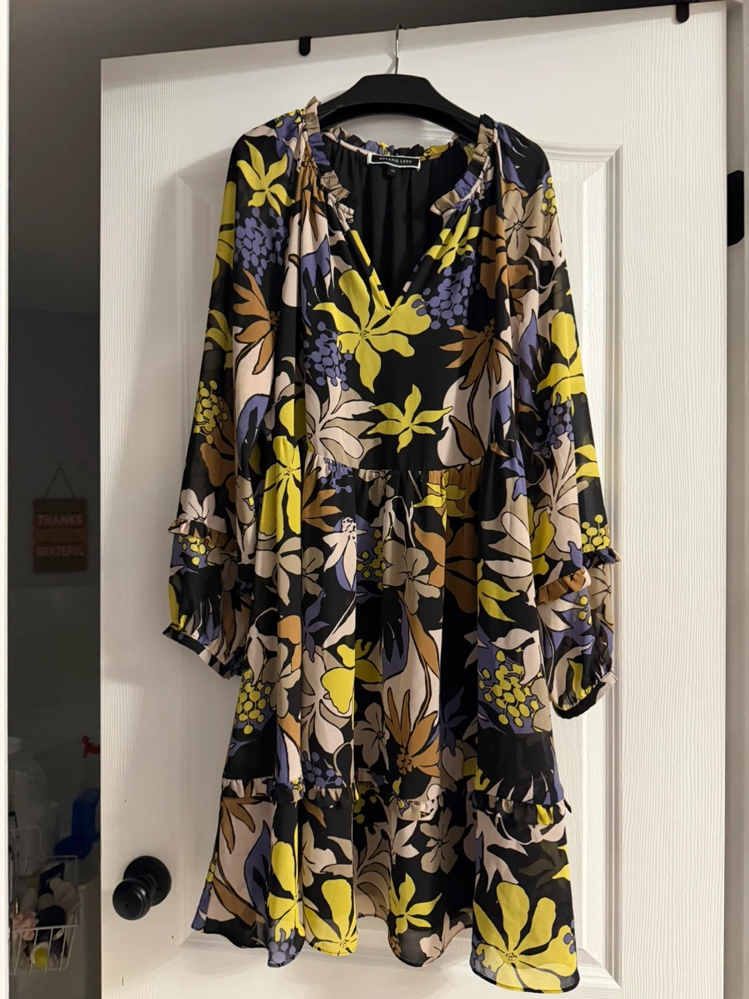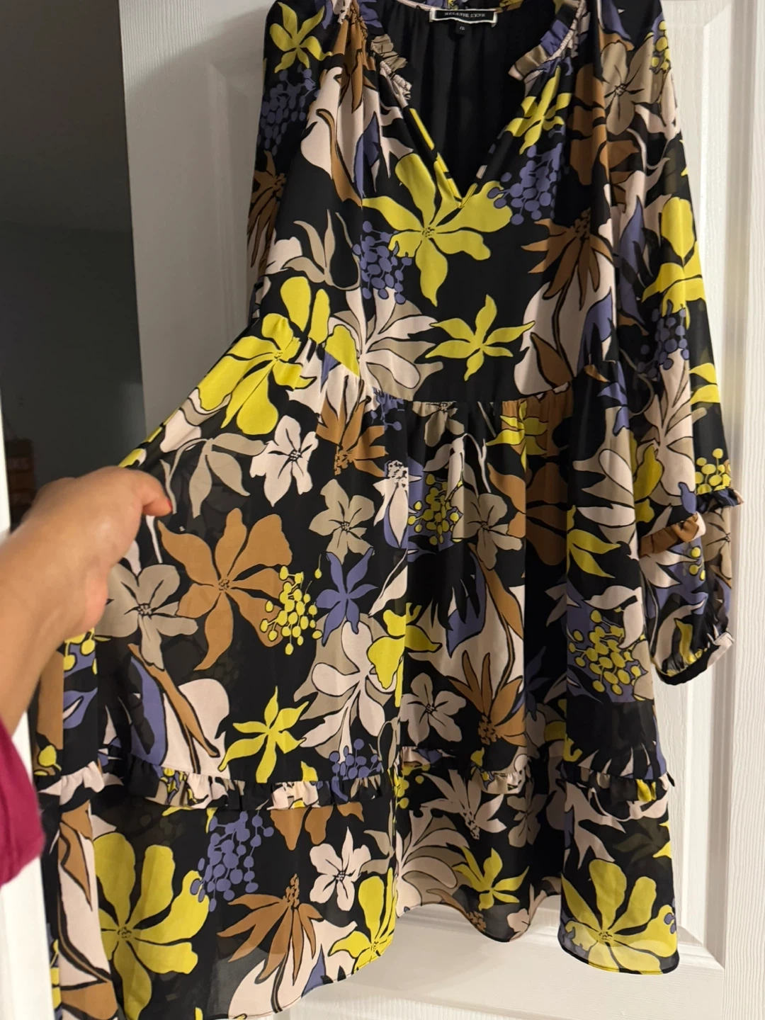 Selling a beautiful Melanie Lyne floral print dress! It's brand new with tags. The dress features a vibrant floral pattern with yellow, brown, and purple flowers on a black background. Perfect for any occasion! Receipt available