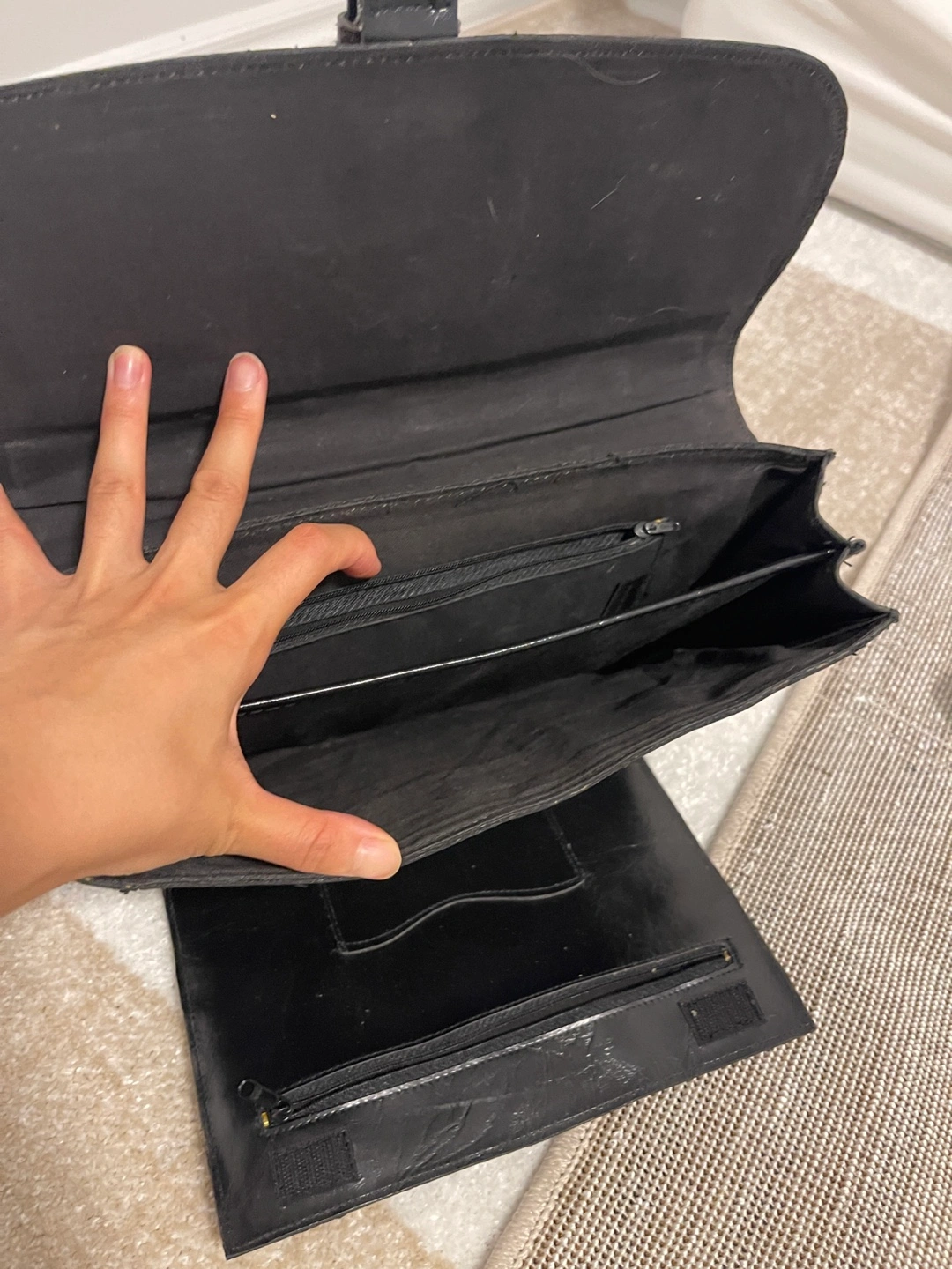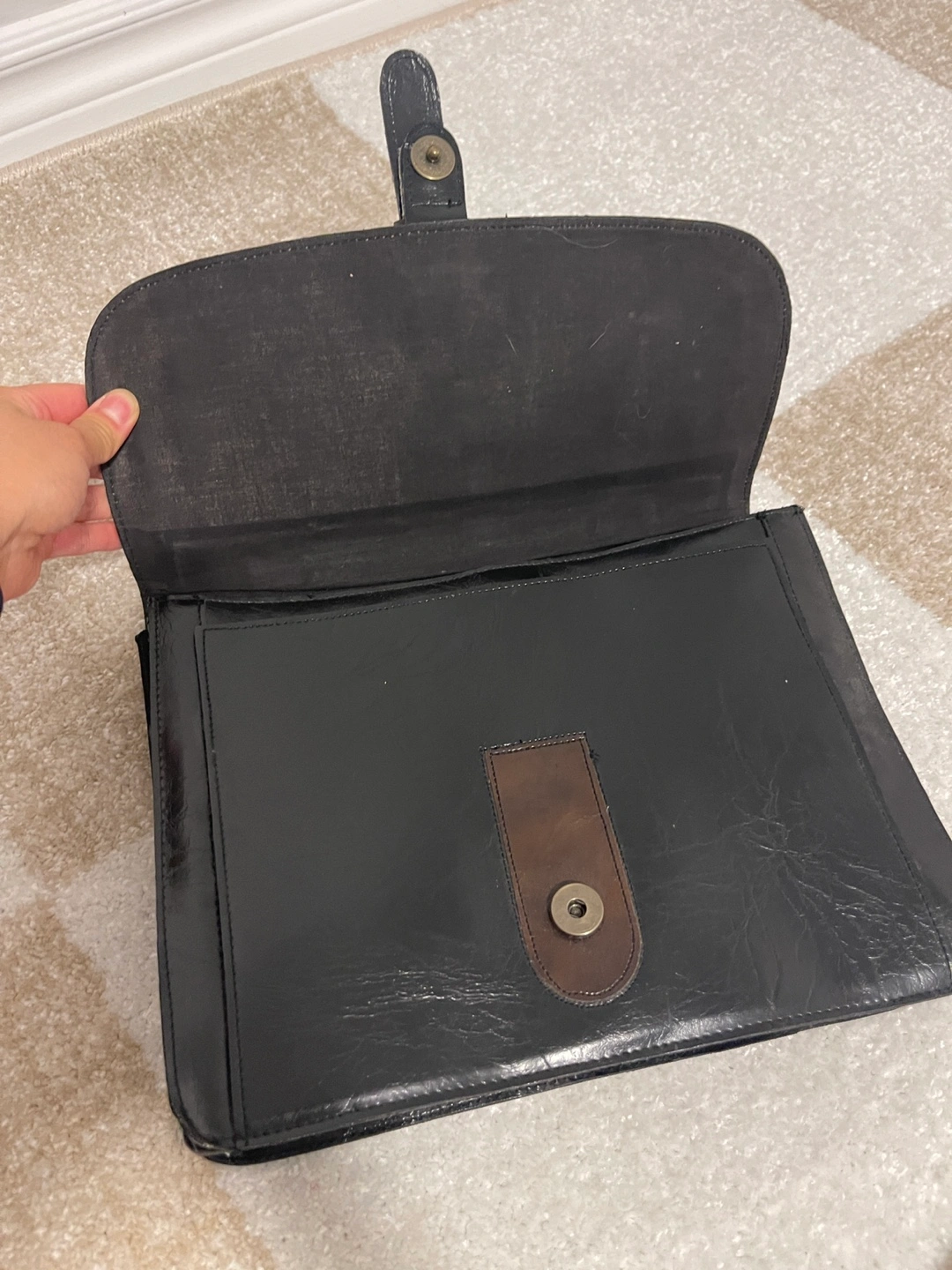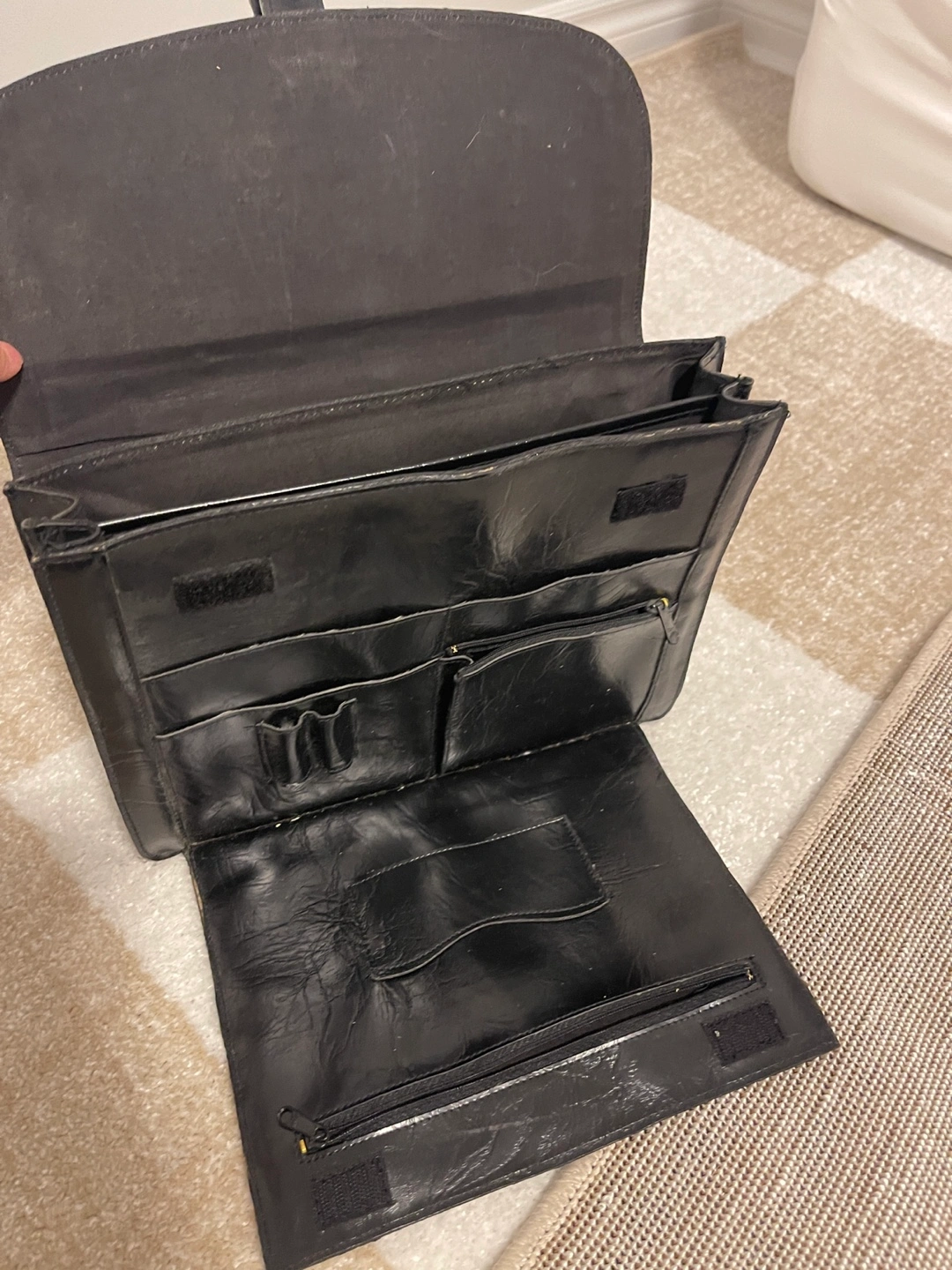 Selling a vintage Classic briefcase. It features a black and brown design with interior compartments for organization. It's perfect for carrying documents and essentials in style