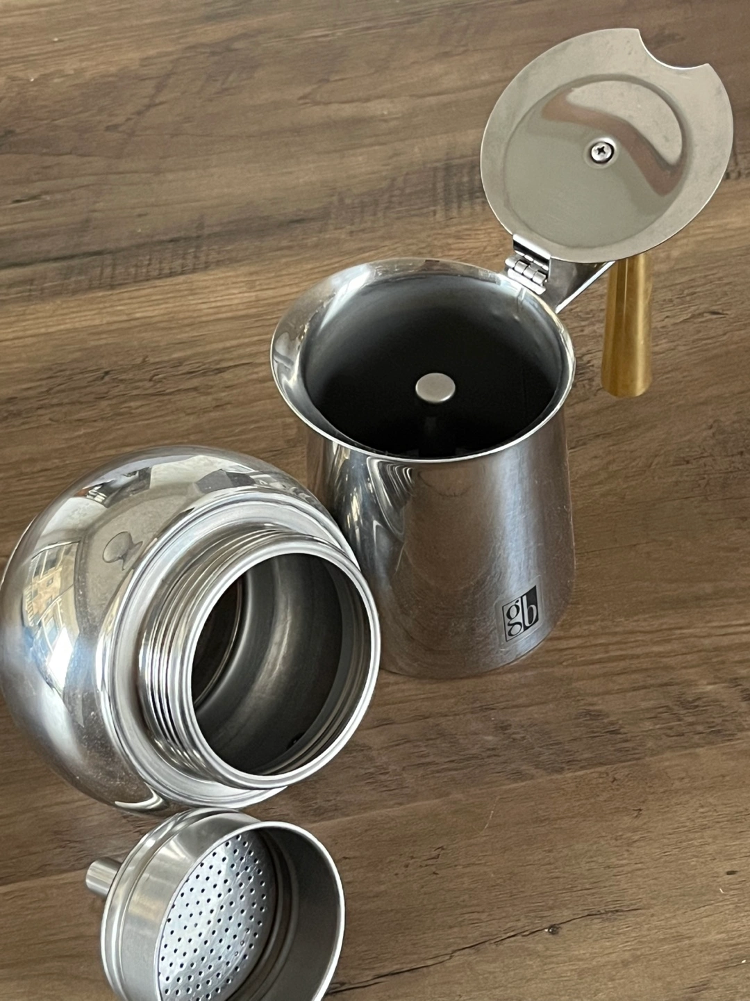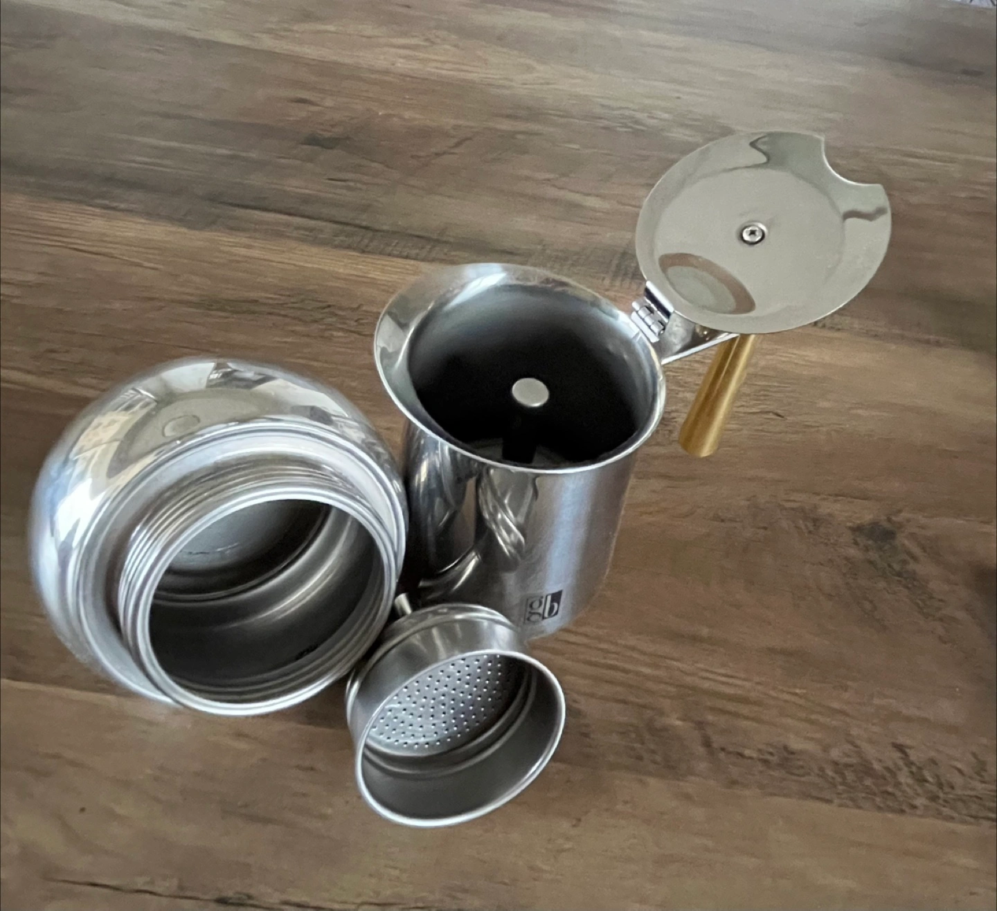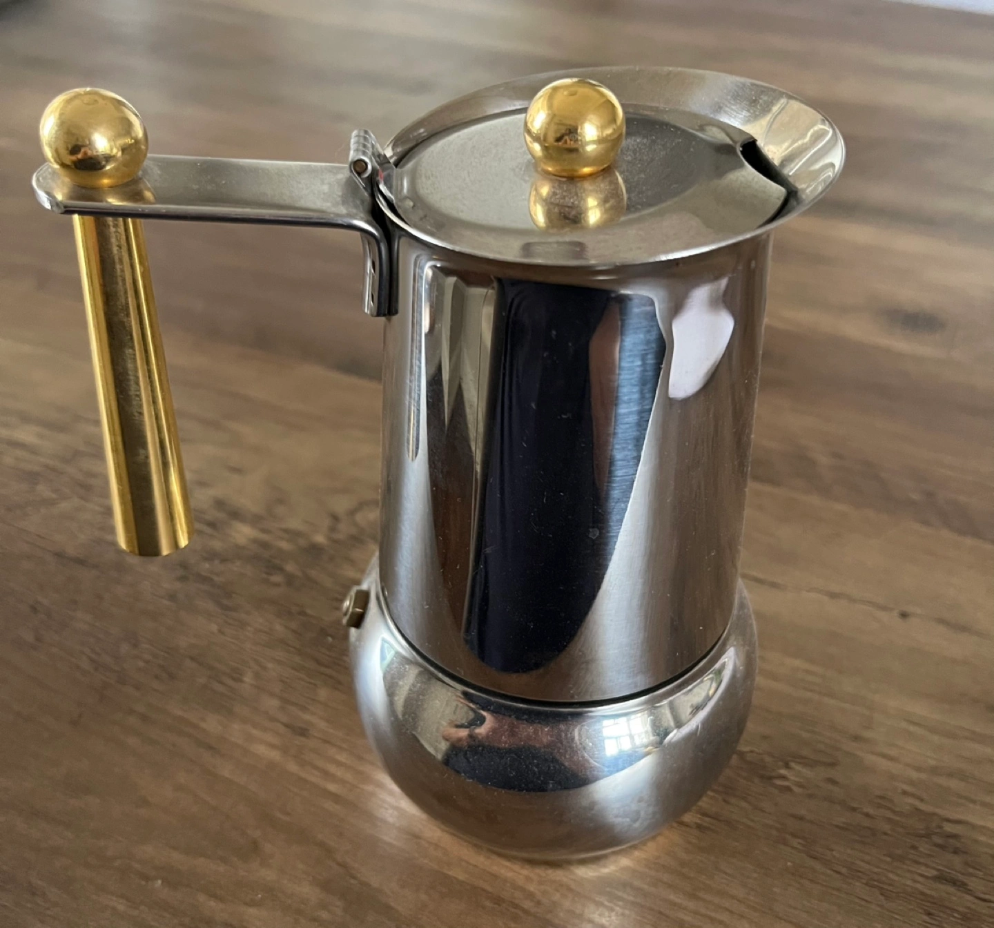 Selling a vintage Italian Espresso Maker. It's stainless steel with gold trim; a Kitty Oro design. Includes two extra gaskets and stainless steel filters.