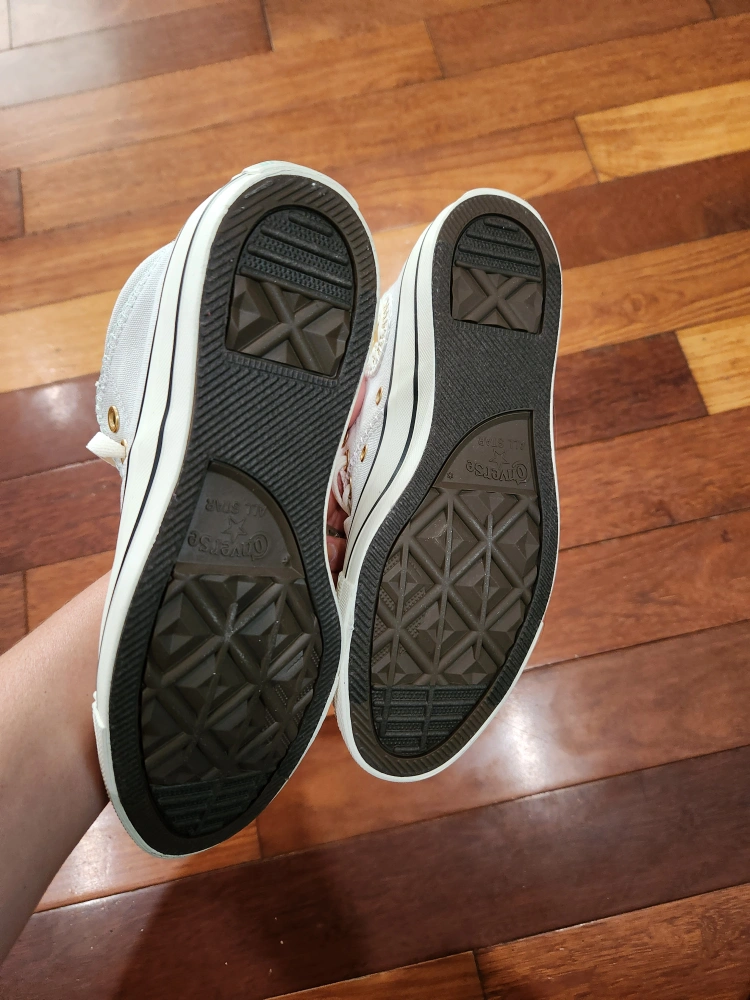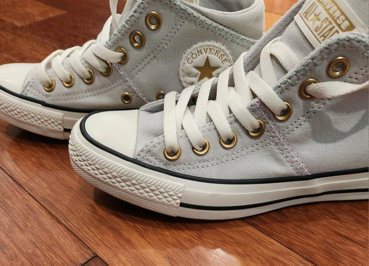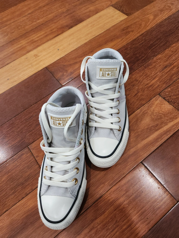 Selling a pair of Converse All Star high top sneakers! They are unboxed but new, my child's feet grew before she could wear them. These classic sneakers feature the iconic Converse design, perfect for any casual outfit. The light gray color is versatile and stylish, making them a great addition to your wardrobe. Size 6.5