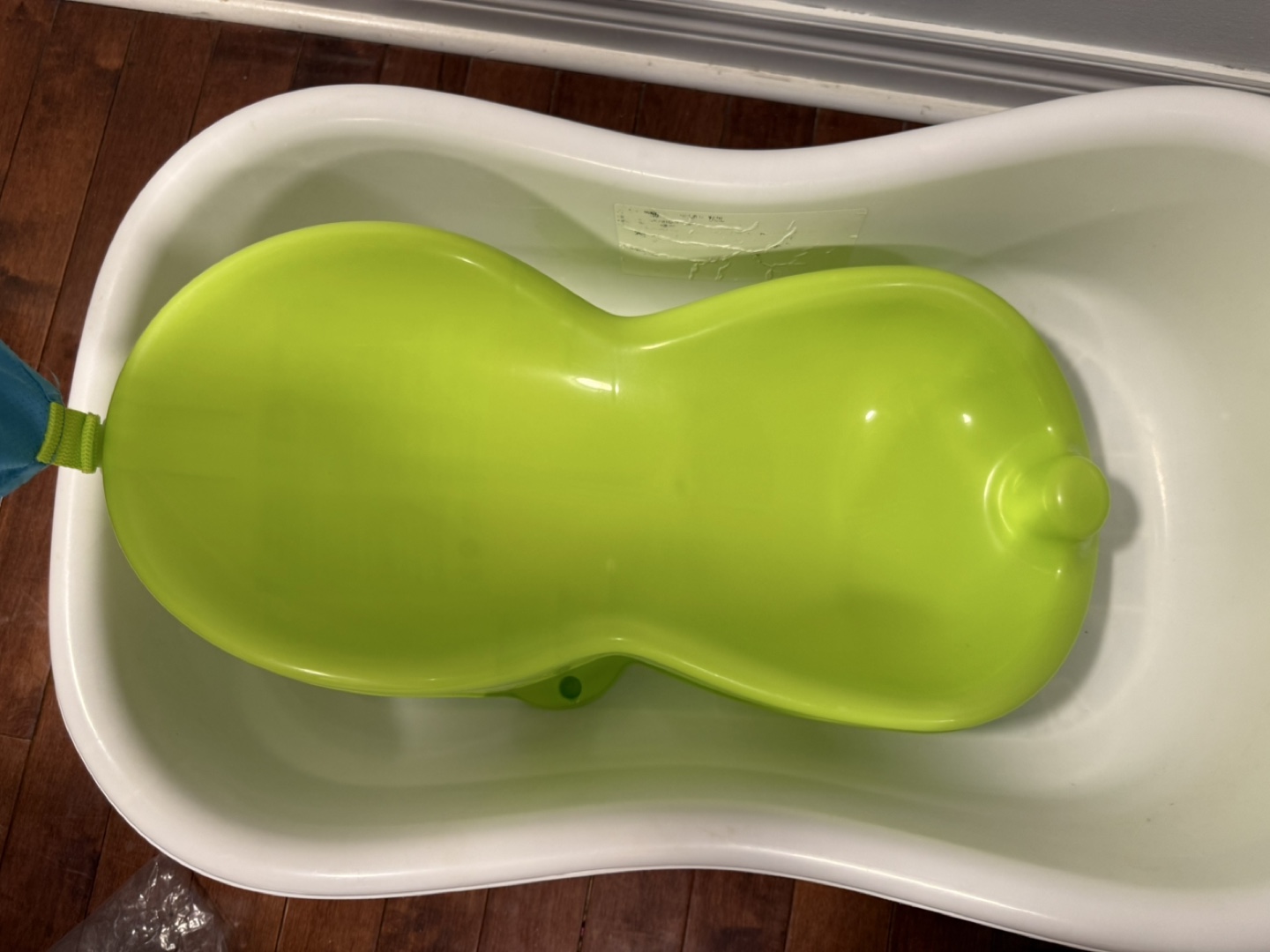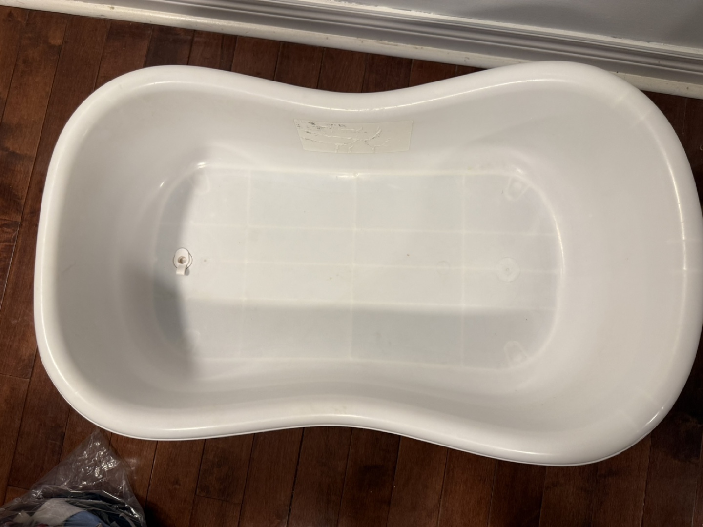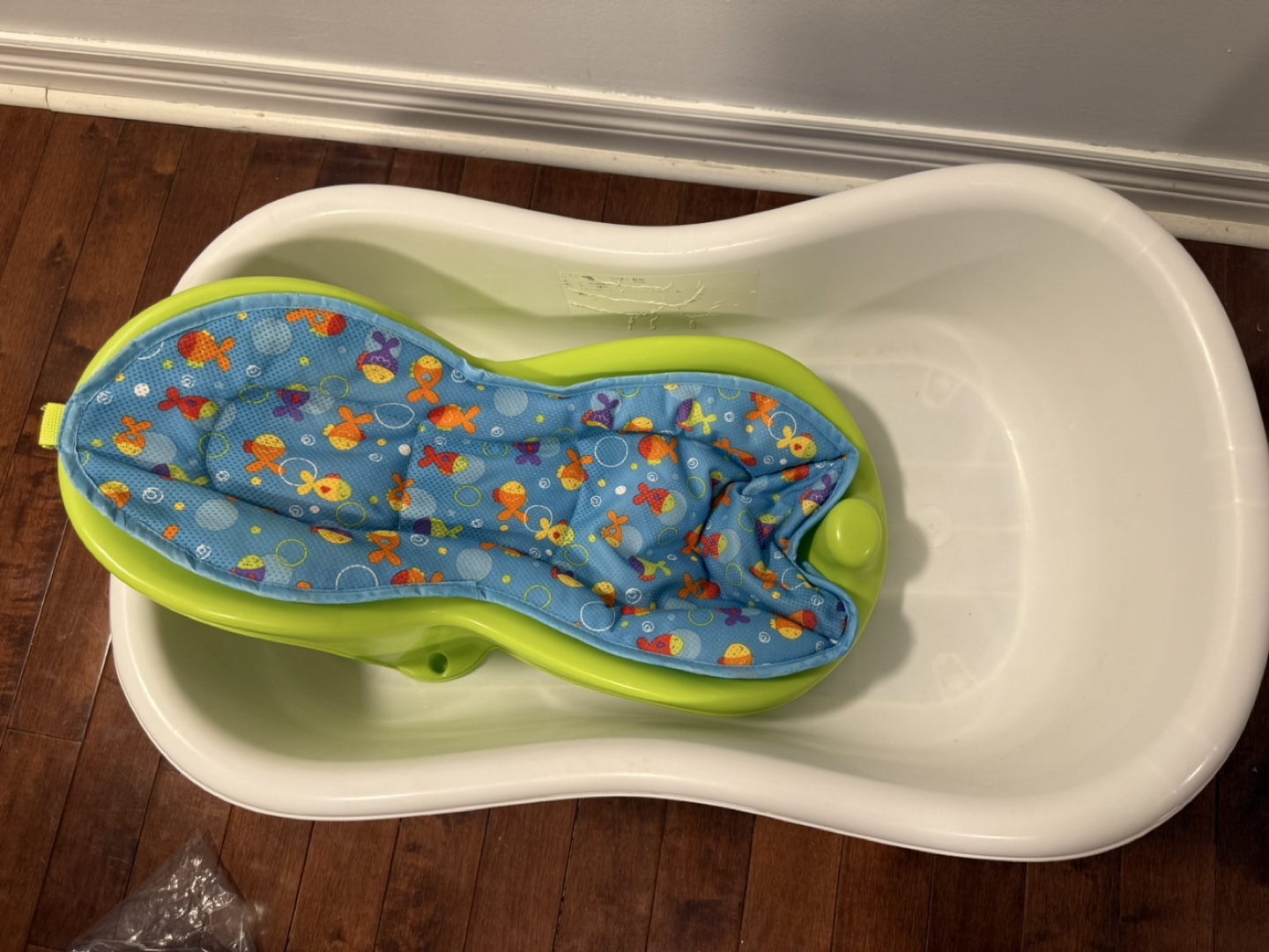 Gently used baby bathtub with a cozy mesh and foam bead insert. Perfect for newborns and infants, making bath time easier and safer. The blue base can come off and act as a stool for kneeling next to a tub/shower. The tub is in great condition and ready for a new home!