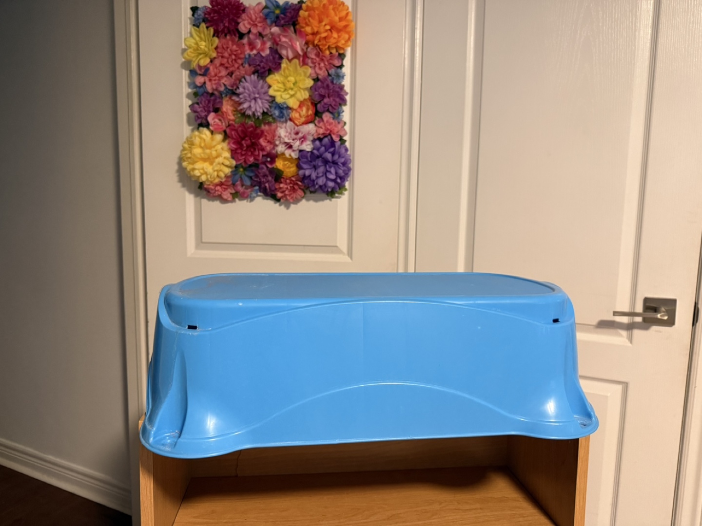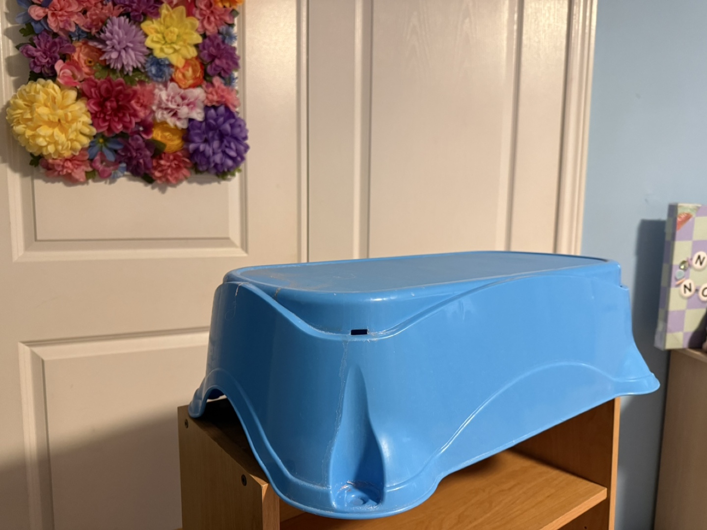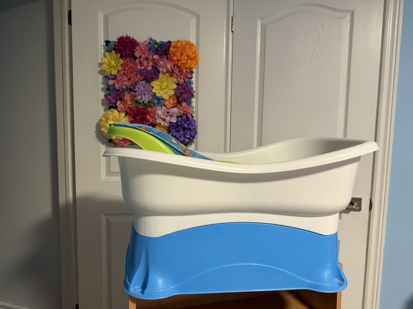 Gently used baby bathtub with a cozy mesh and foam bead insert. Perfect for newborns and infants, making bath time easier and safer. The blue base can come off and act as a stool for kneeling next to a tub/shower. The tub is in great condition and ready for a new home!