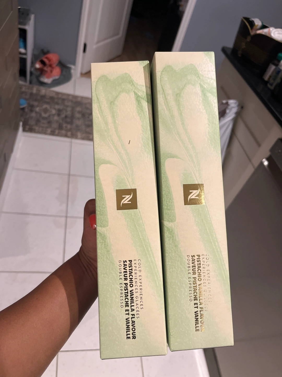 2 full sleeves - 20 pods Selling Nespresso Pistachio Vanilla Flavour Double Espresso capsules! Perfect for a cold coffee experience. The box is included