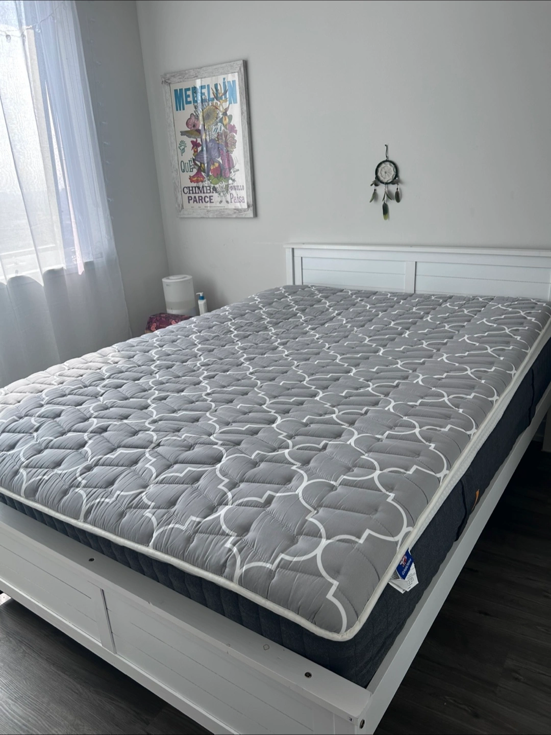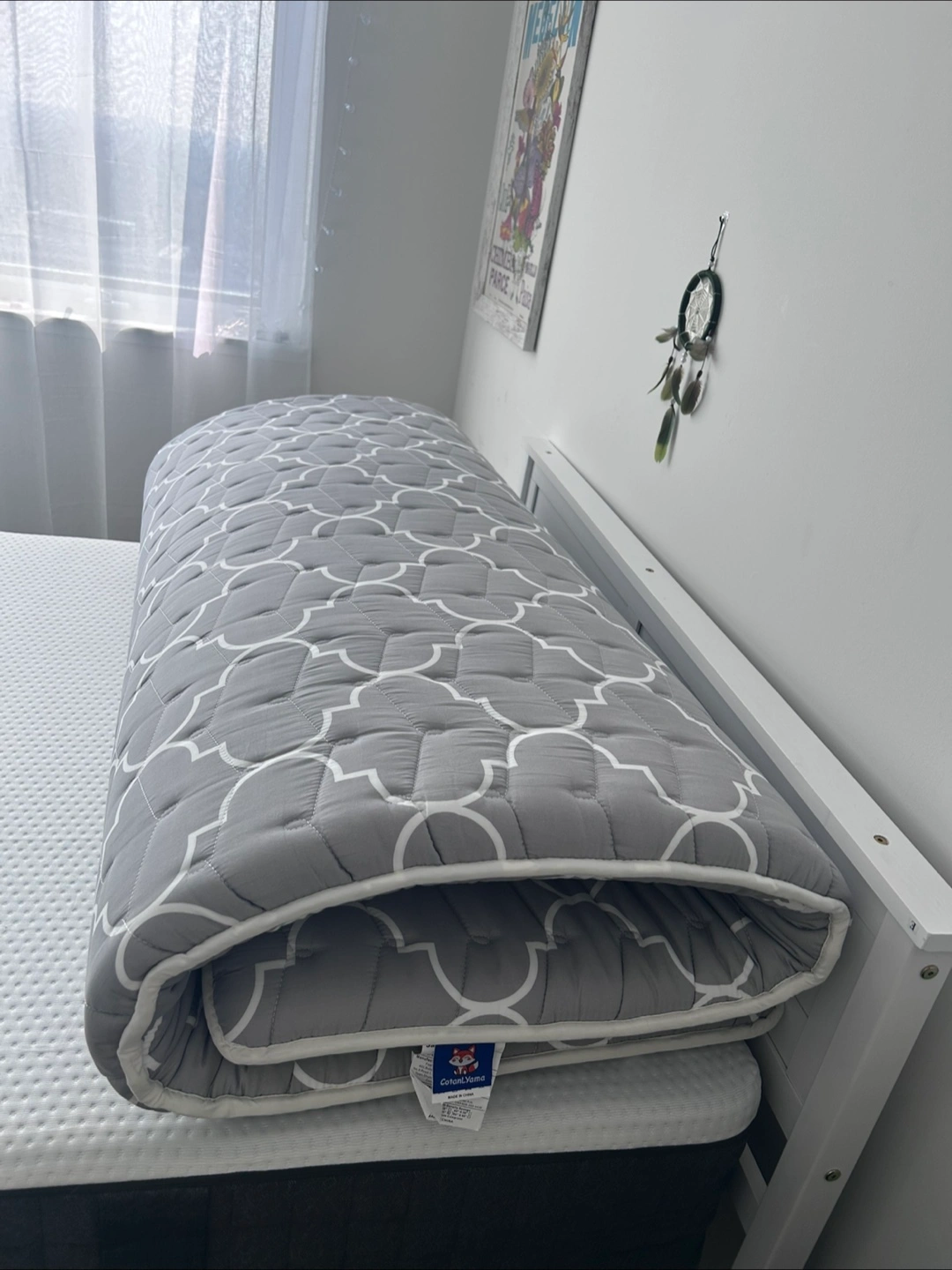This is a comfy full-size Japanese futon floor mattress made of high-density foam and microfiber. It can be used as a floor mattress, mattress topper, yoga mat, or kids' floor mat. It's in great condition and was only used for two months during a visit. It's in great condition and ready for a new home!