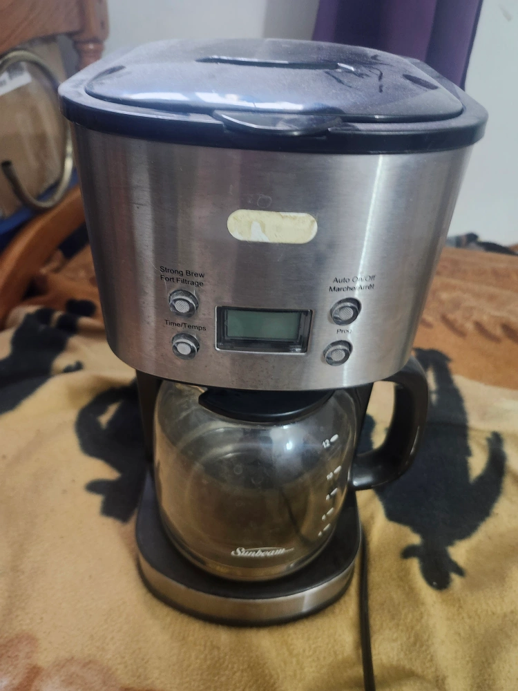 I'm selling a Sunbeam coffee maker that can brew up to 12 cups. It has a strong brew option and an auto on/off function. Perfect for your morning coffee!
