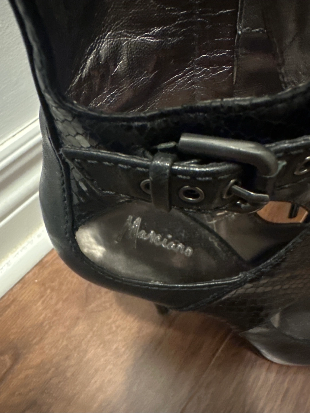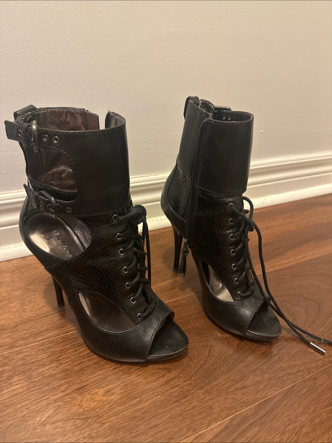 These are a pair of stylish vintage black Marciano heels. They feature a unique lace-up design and are in great condition. Perfect for a night out!