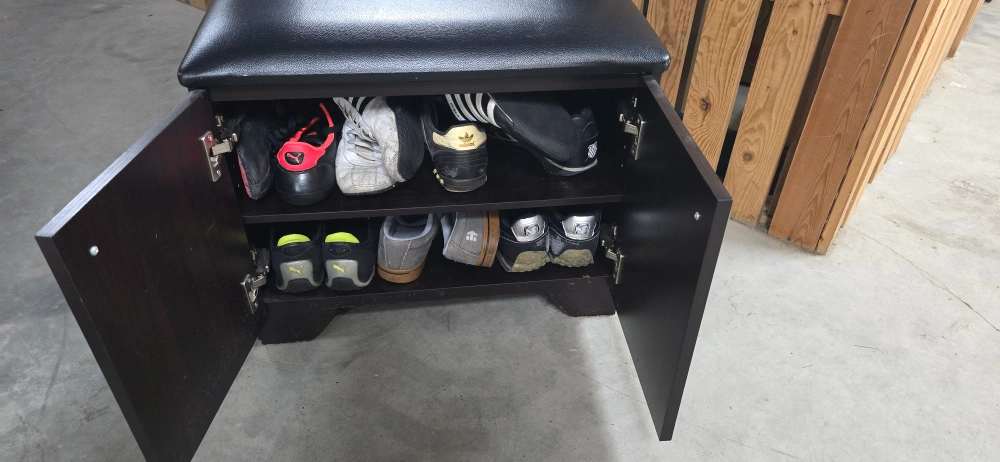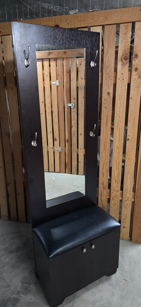 Hall tree with a bench and mirror, perfect for an entryway or mudroom! The bench has a storage compartment underneath, ideal for shoes or other items. It features a dark brown finish and a black upholstered seat. Great for organizing your space and adding a touch of style
