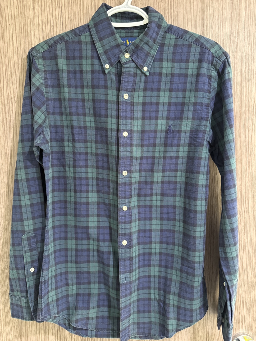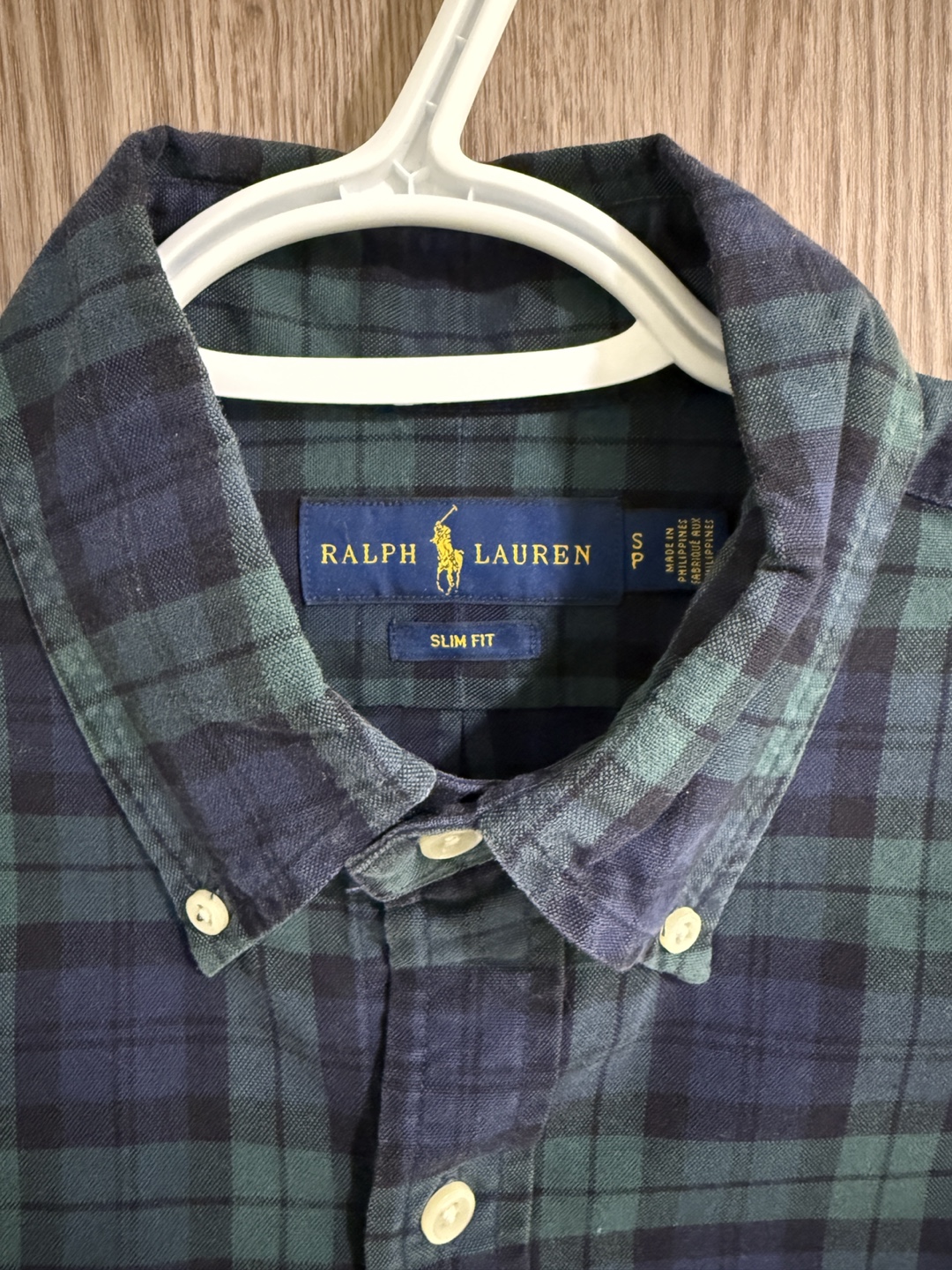 Here's a Ralph Lauren slim fit plaid shirt in size small! It's a classic button-down with a timeless design. The shirt features a blue and green plaid pattern. Great for a casual or semi-formal look!