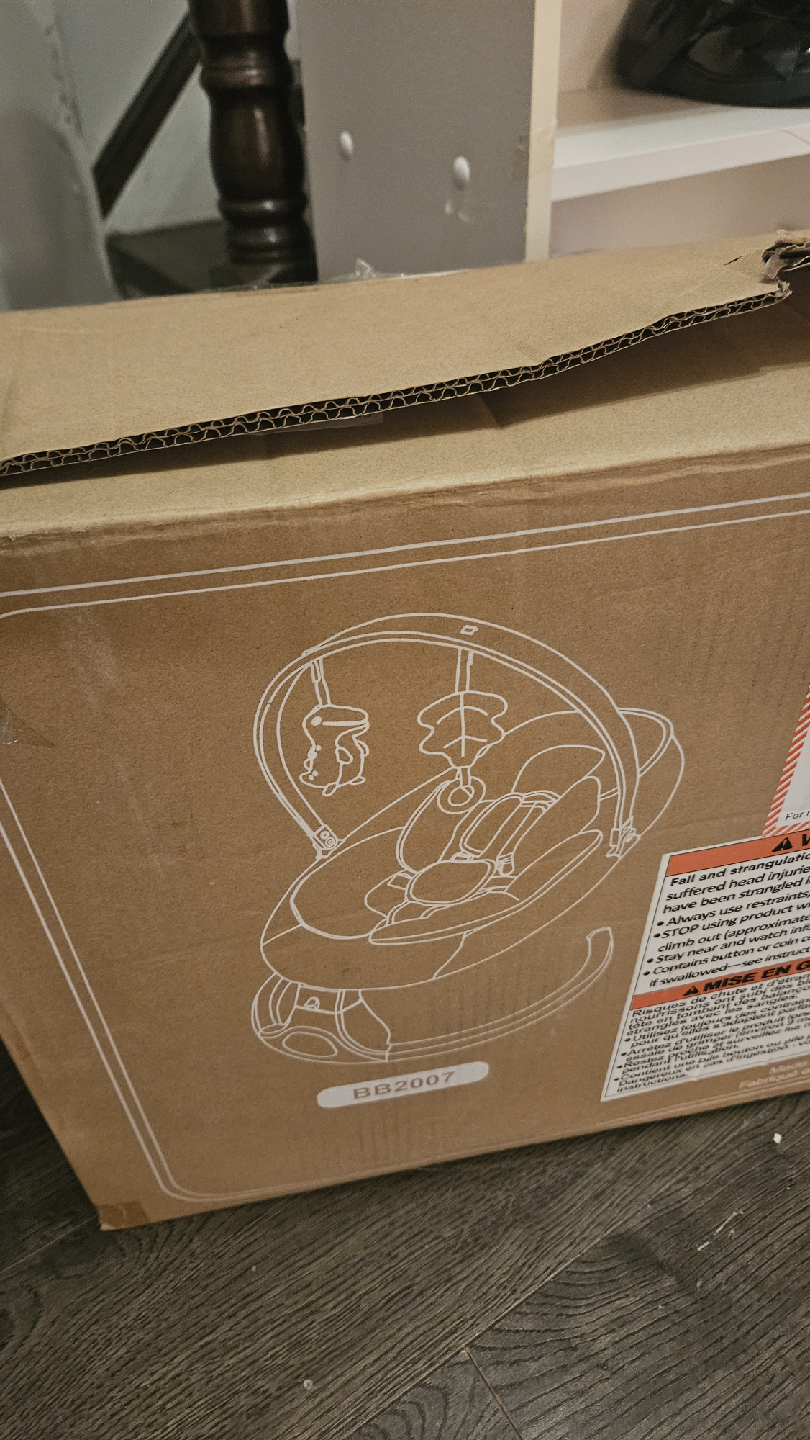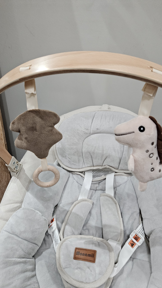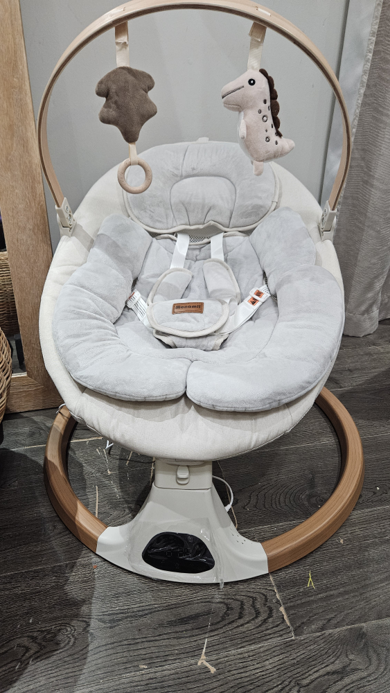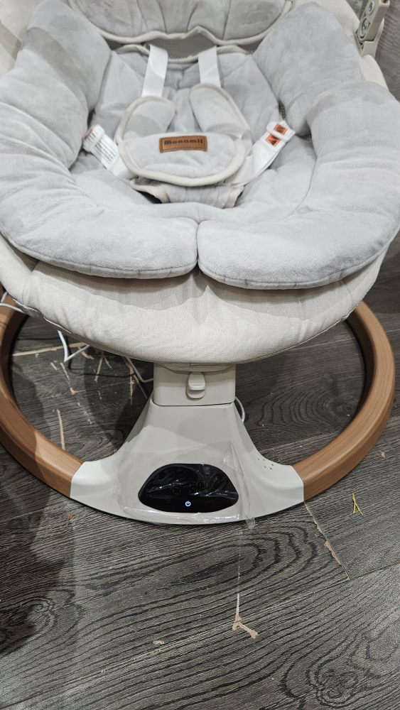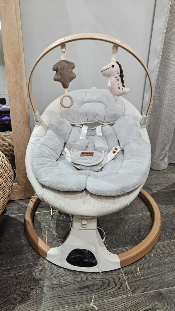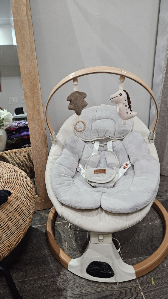 Looking to sell this Momonii baby swing. It's in great condition and ready for a new home. It features a soft, plush seat and gentle swinging motions to soothe your little one. The swing also includes cute hanging toys to keep your baby entertained!